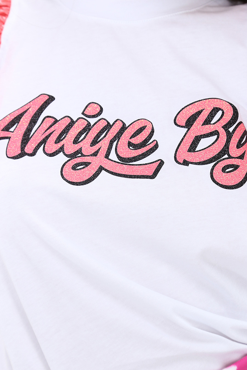 Cotton T-shirt with latex cap sleeves. Round neck and front logo print with glitter. The model is 1.78 tall and wears size 40.