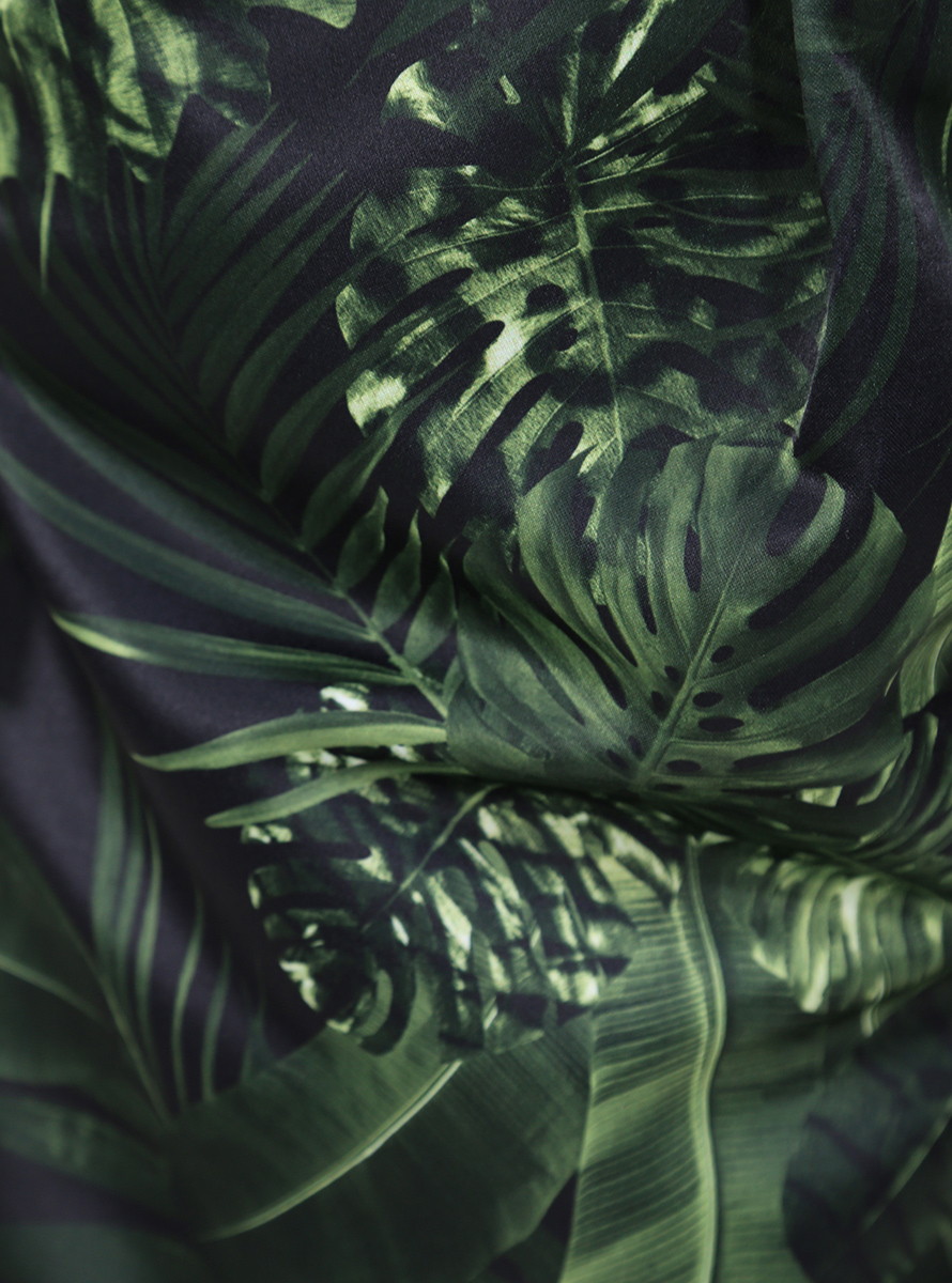 Bermuda in duchess Gaelle Paris with high waist. Slash pockets with front pleats and turn-up at the bottom. Jungle fantasy. The model is 1.70 tall and wears size 40.