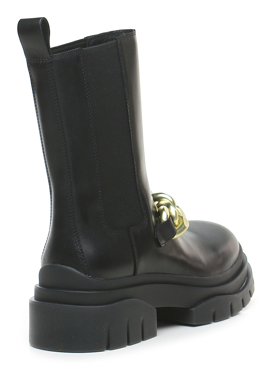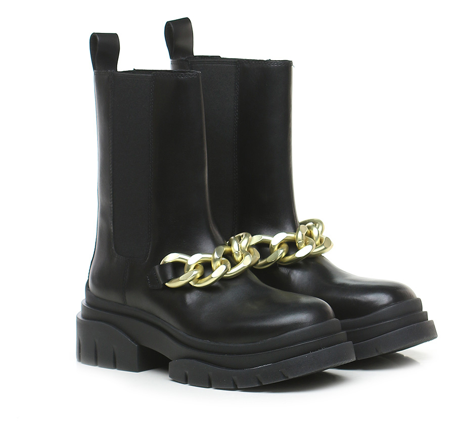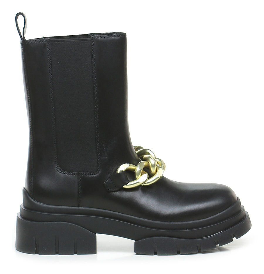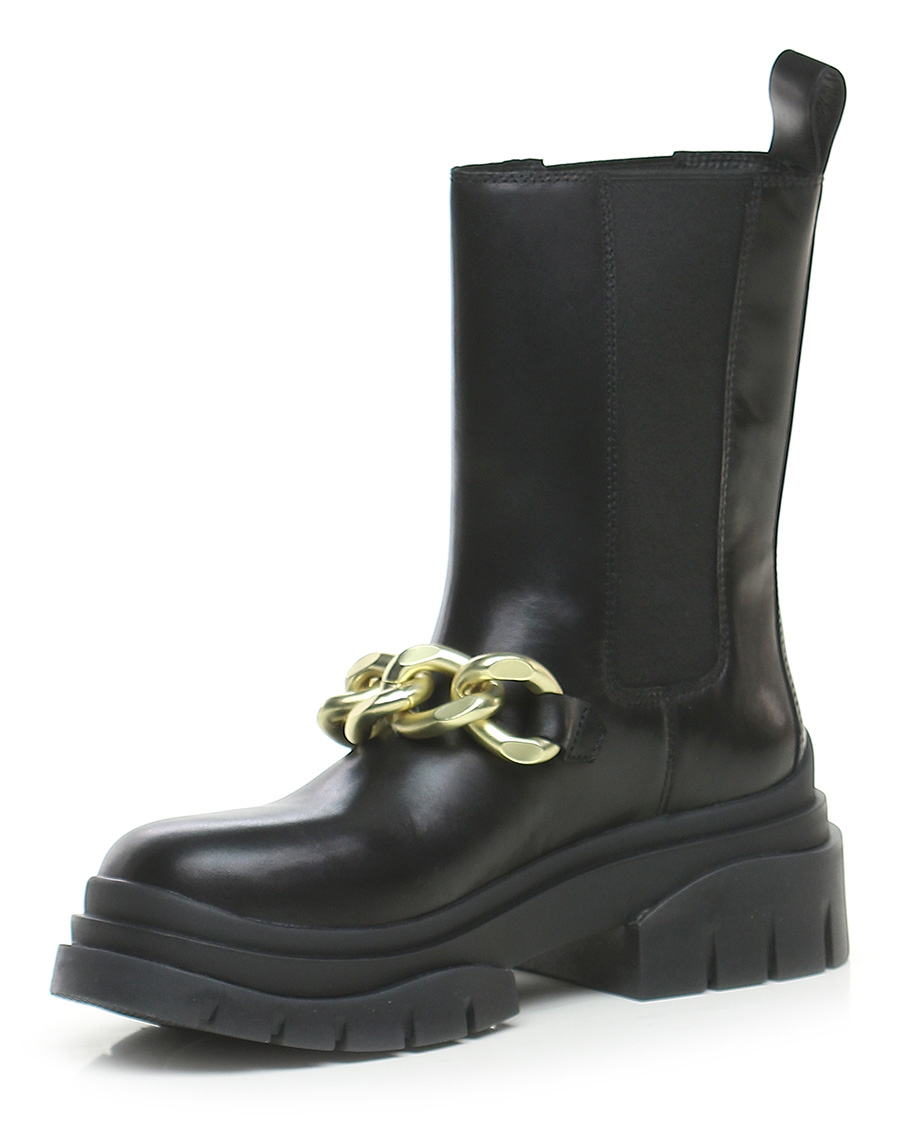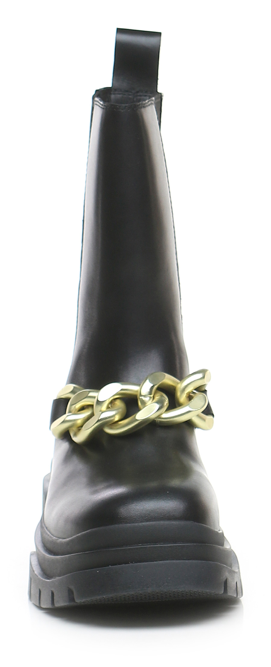 Leather ankle boot with side elasticated inserts and gold chain front accessory. Rubber lug sole. 55mm heel height, 35mm platform with 20mm ledge.