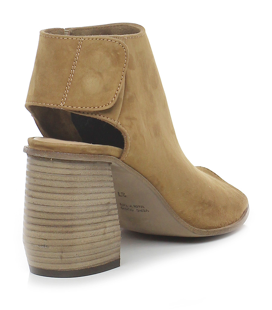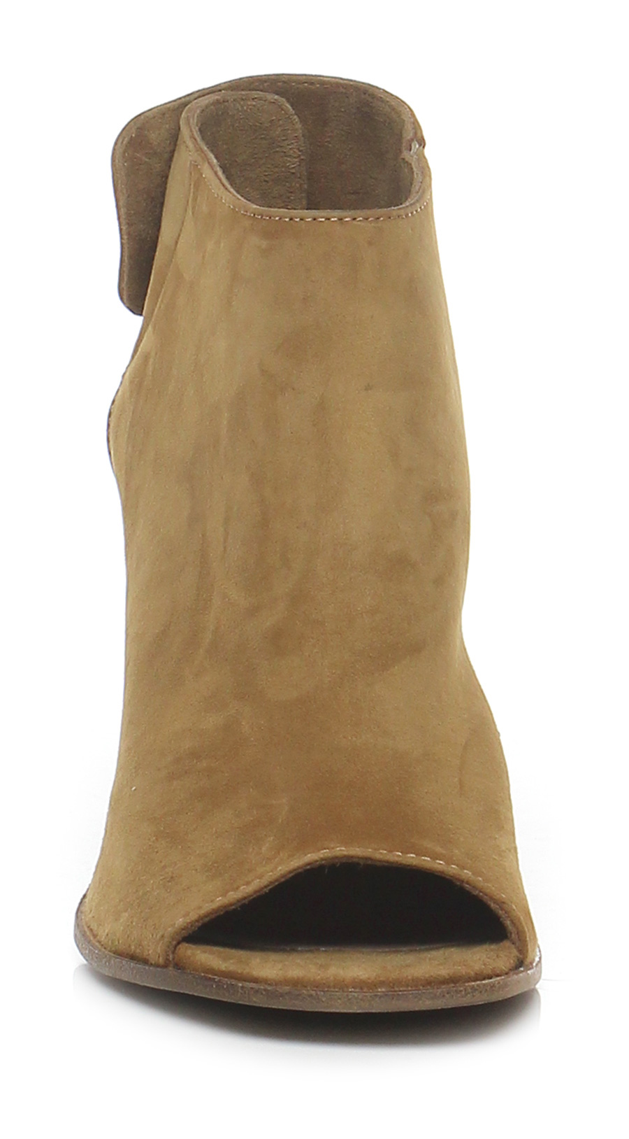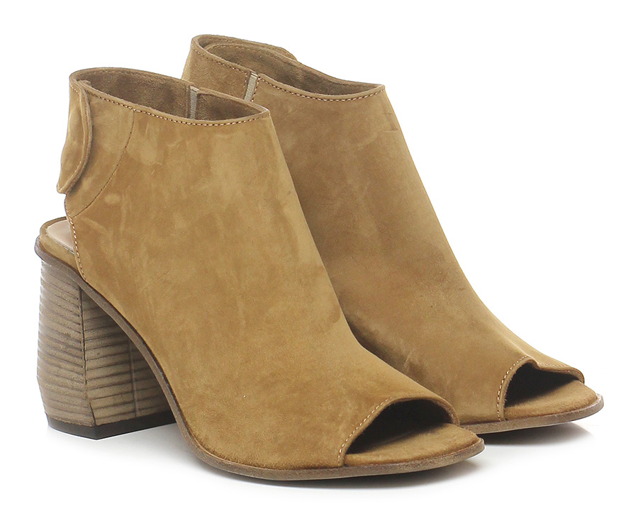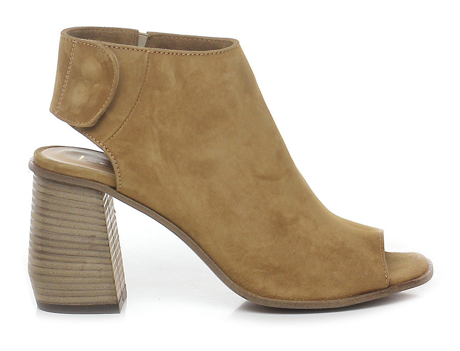 Nubuck ankle boot with ankle strap with elasticated inserts, snap button closure, leather sole. 90 heel, wood effect.
