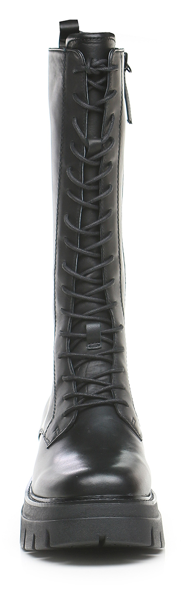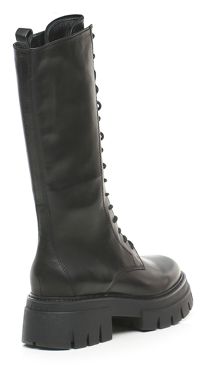 Leather boot with side zip. Rubber lug sole. 55mm heel height, 35mm platform with 20mm ledge. Leg height 29cm.