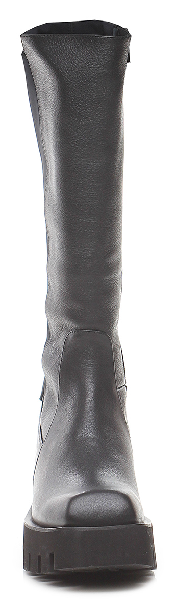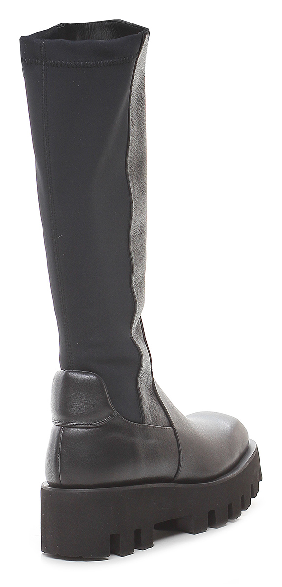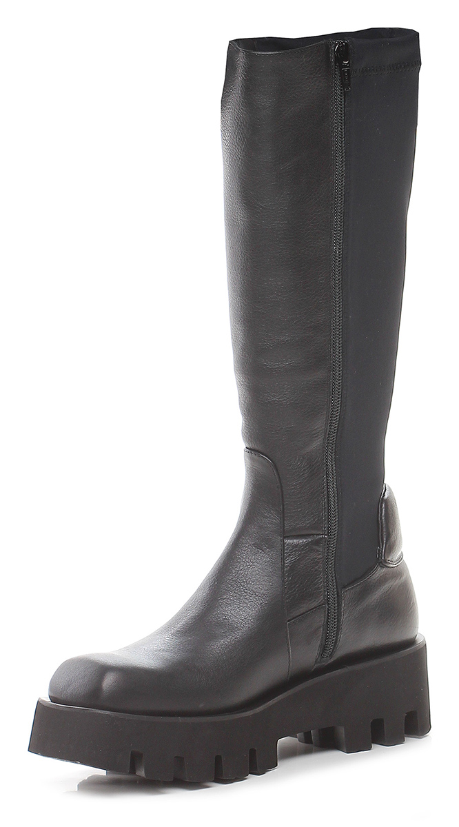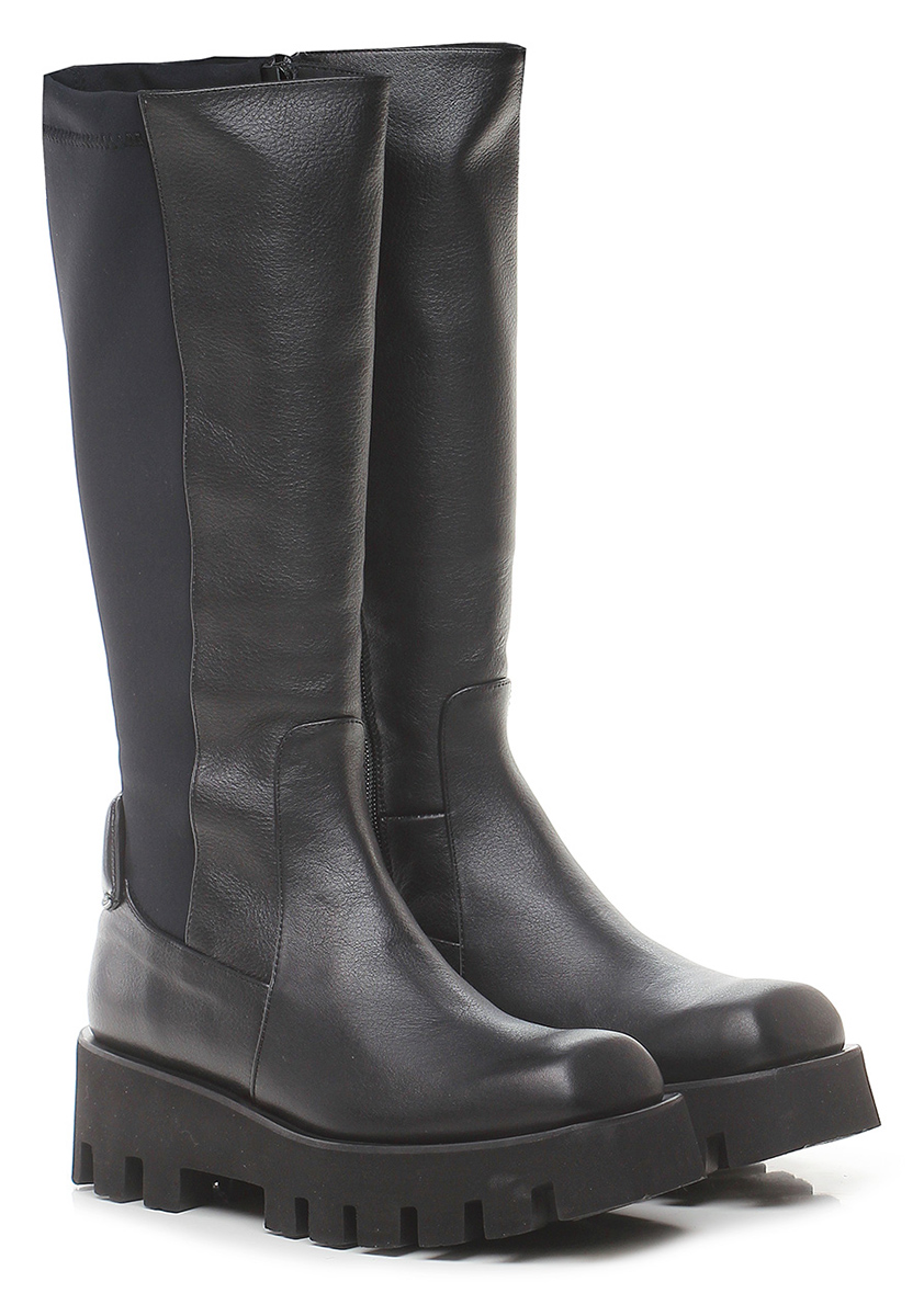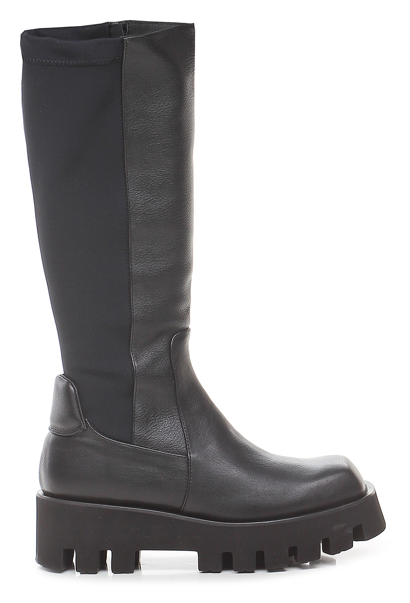 Hammered effect leather boot with part of the leg in stretch fabric. Side zip. Light rubber lug sole. Heel height 55mm, platform 35 with 20mm ledge. Leg height 36 cm.