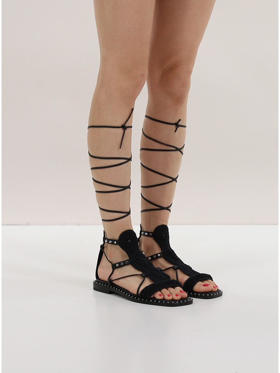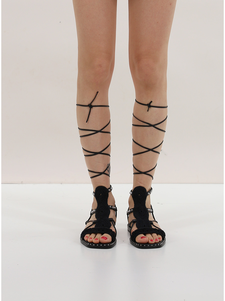 Sandal in fabric and leather with ankle strap and studs on the upper. Rubber sole. Heel height 20mm. Studs on the sole profile.