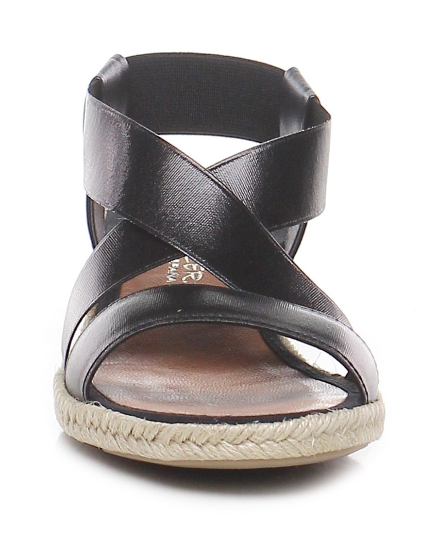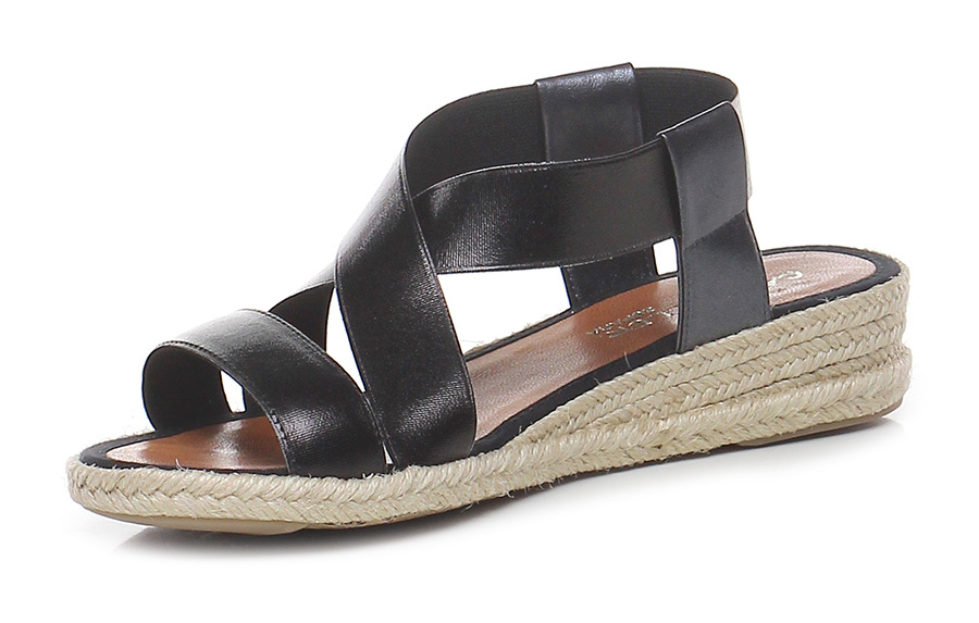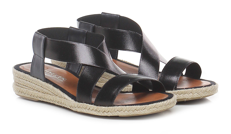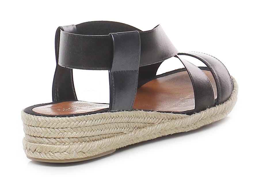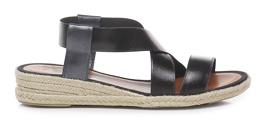 Low sandal in laminated stretch fabric with laminated leather inserts, rubber sole. Heel 35, sole edge covered in rope.