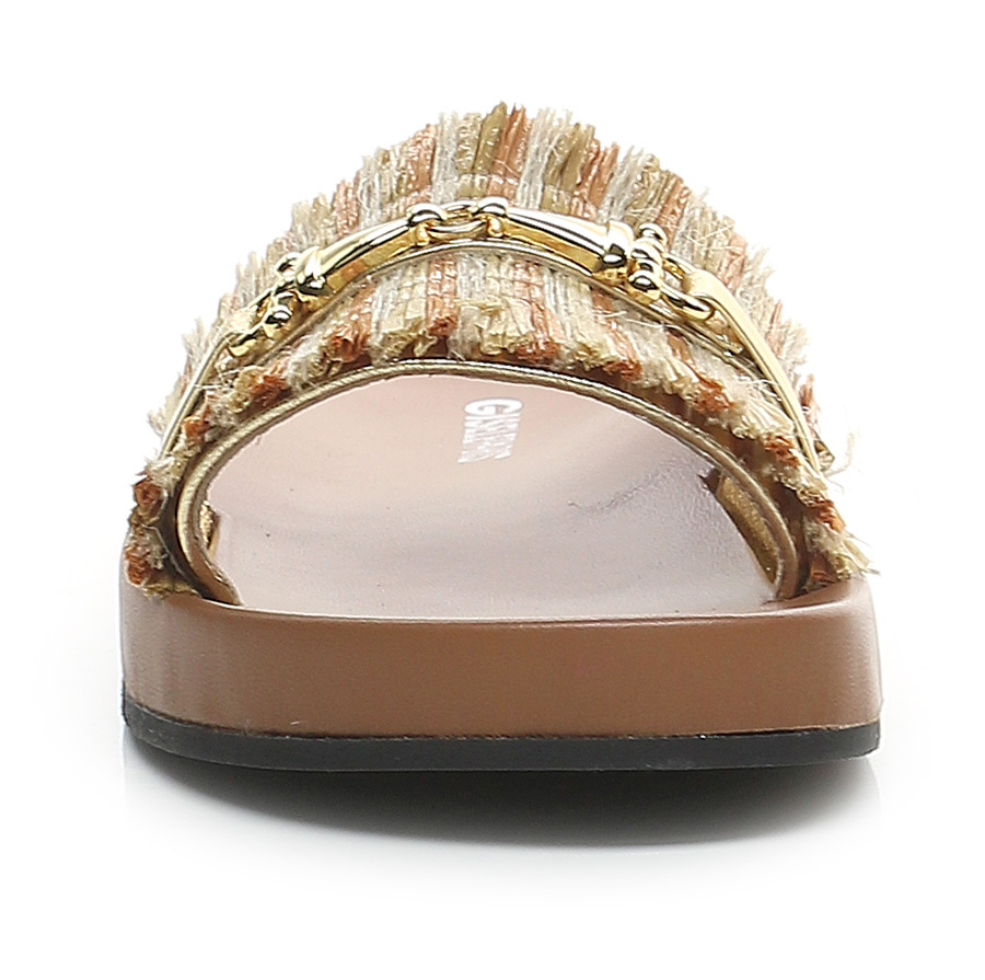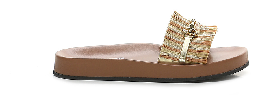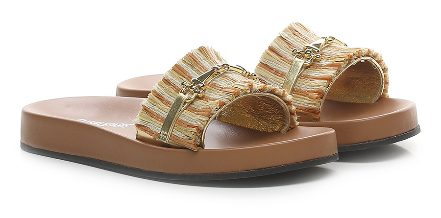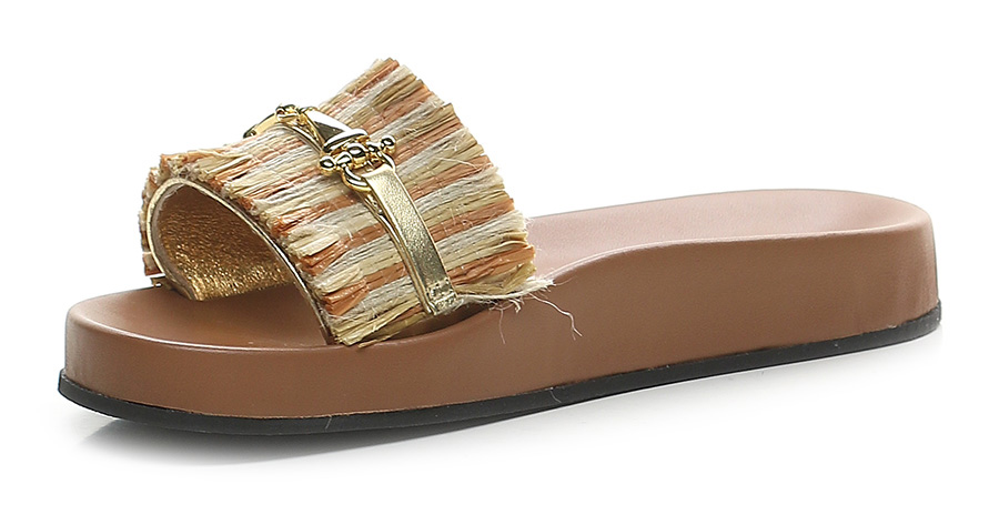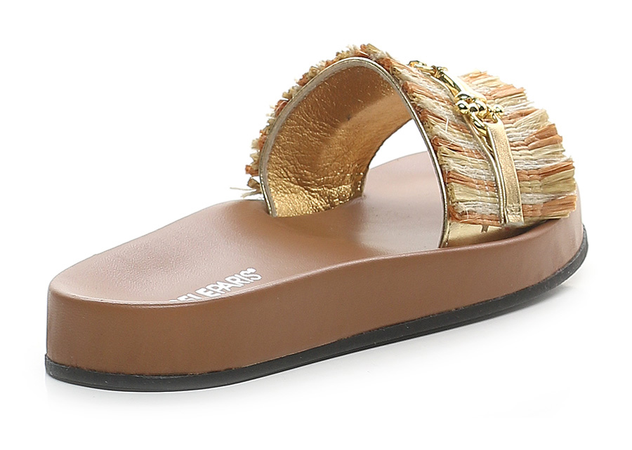 Sandal in laminated leather with front clamp. Rubber sole. Heel height 30mm, platform 20mm with 10mm ledge.