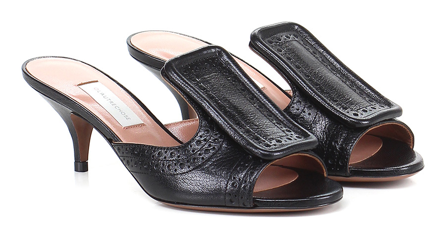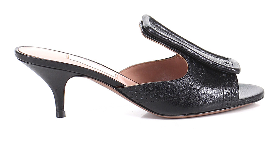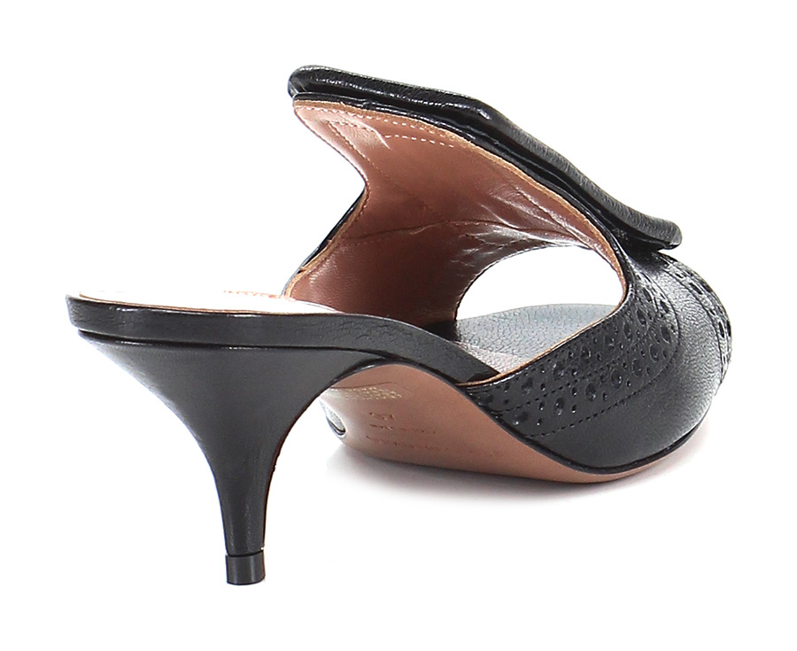 Low sandal in worked leather with worked profiles and leather sole. 65 heel.