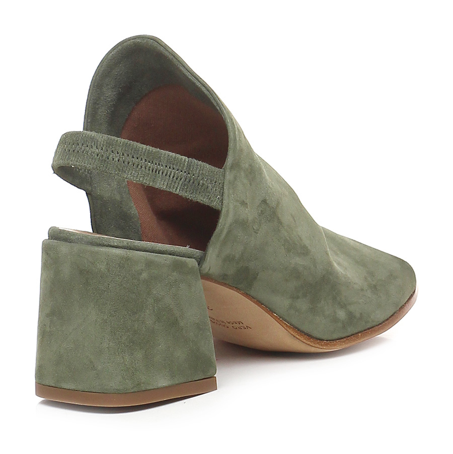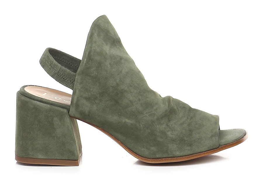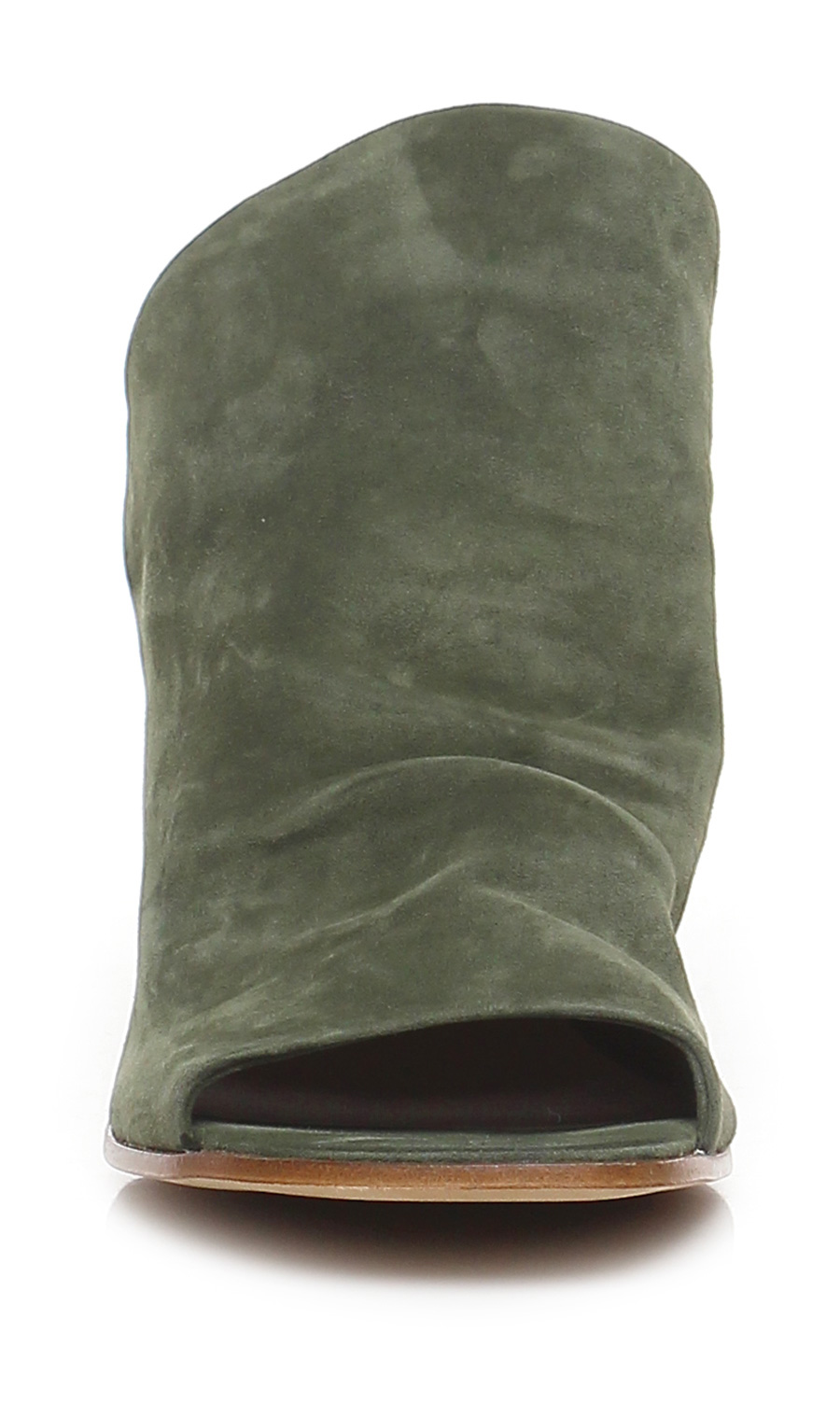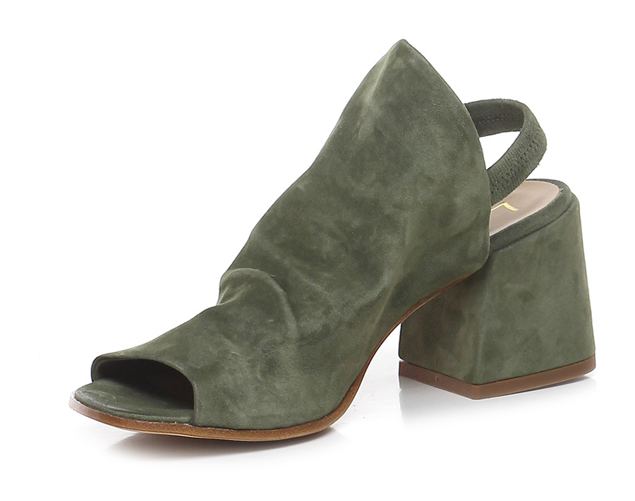 Low suede sandal with elasticated back strap. Heel 75, covered in suede.