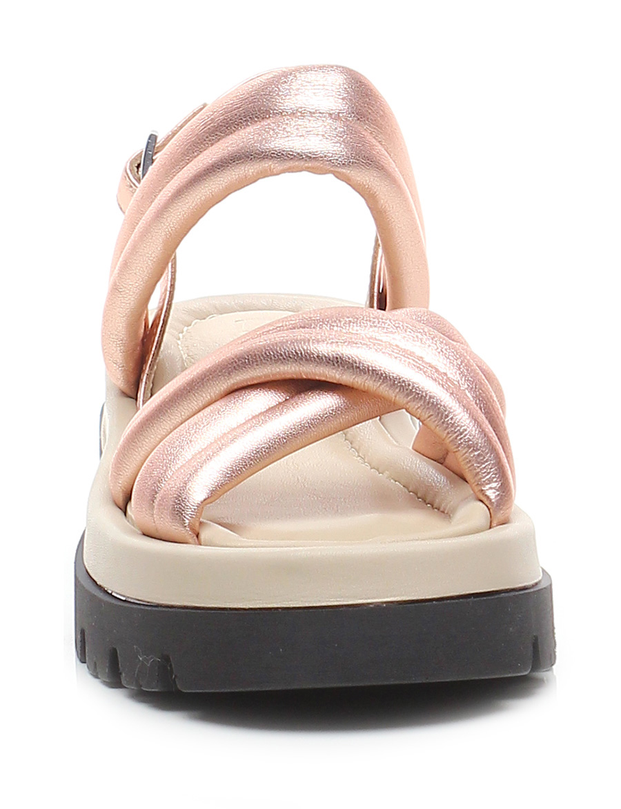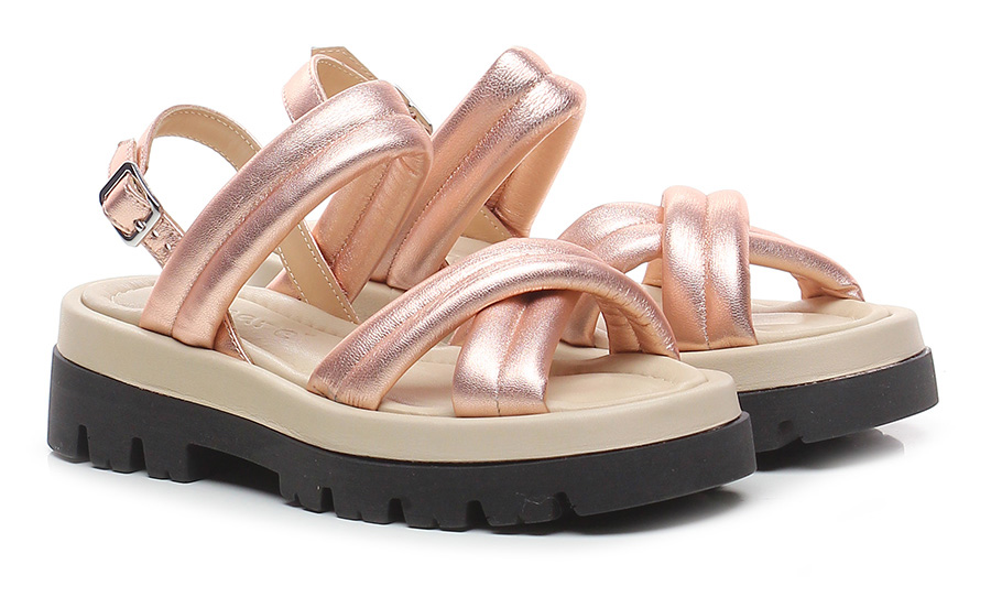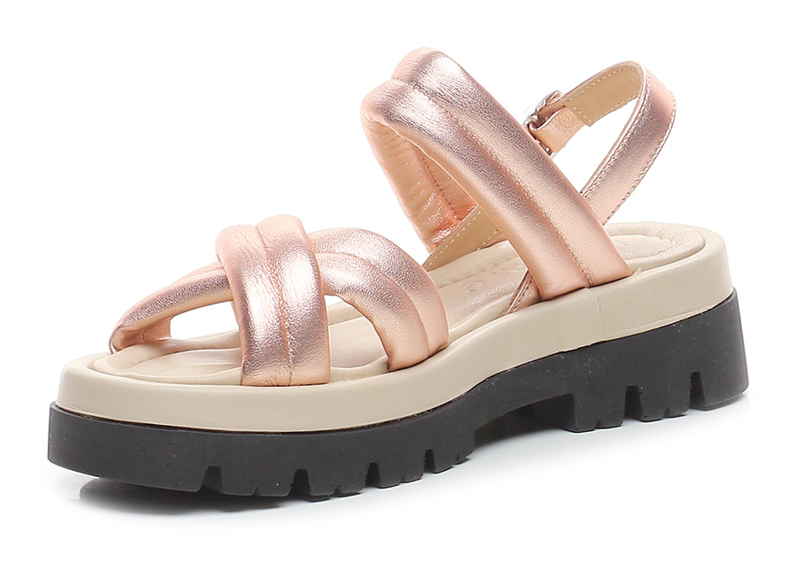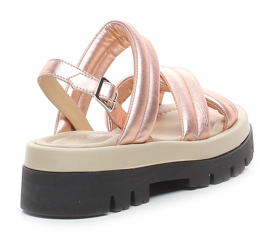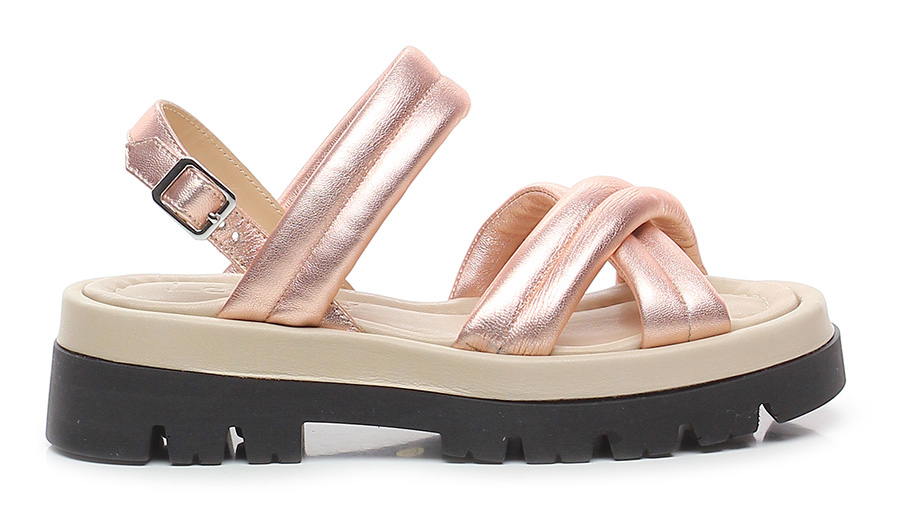 Flat sandal in padded laminated leather with strap on the back, lug rubber sole. Heel 50, platform 35 with ledge 15. Soft padded insole.