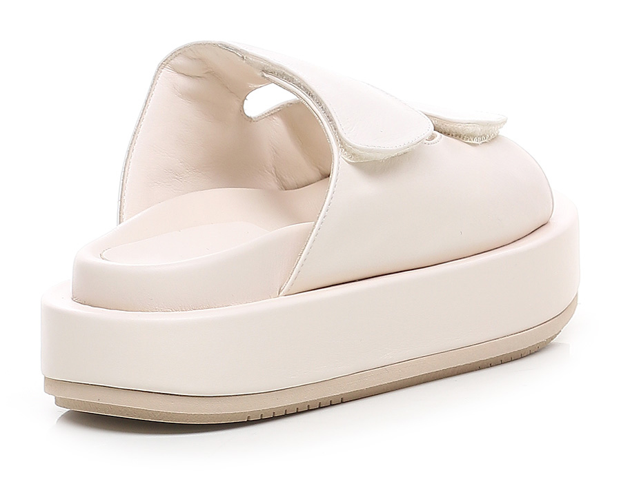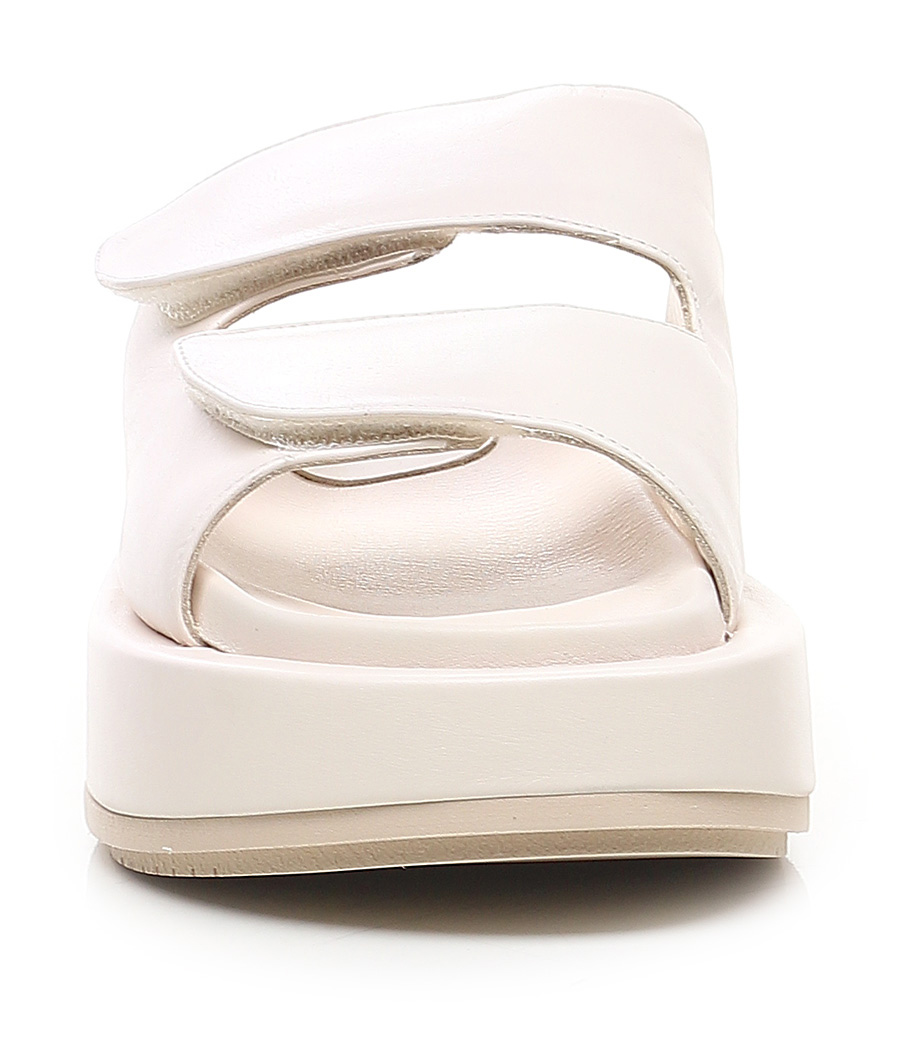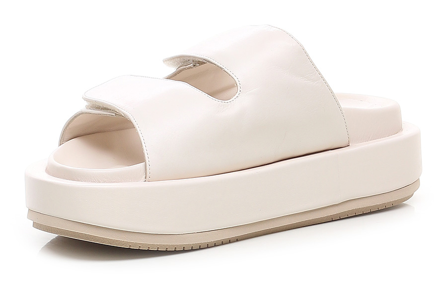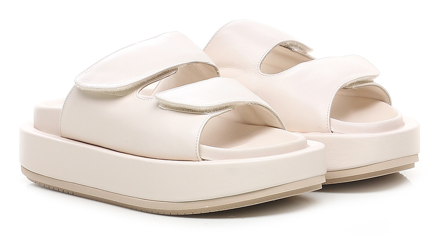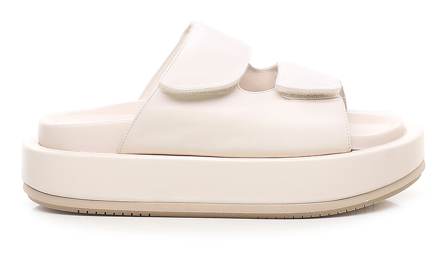 Leather sandal with double strap with front strap closure. Rubber sole. Leather lined platform. Heel height 55mm, platform 50mm with 5mm ledge.