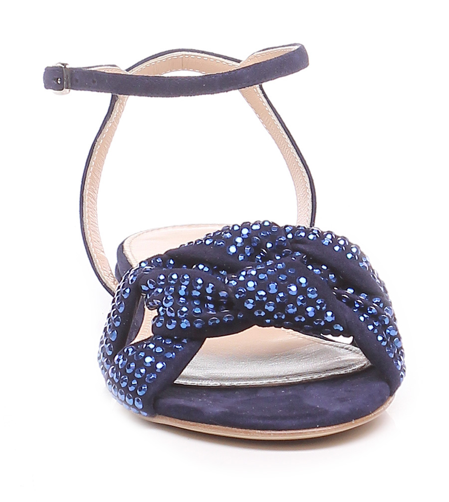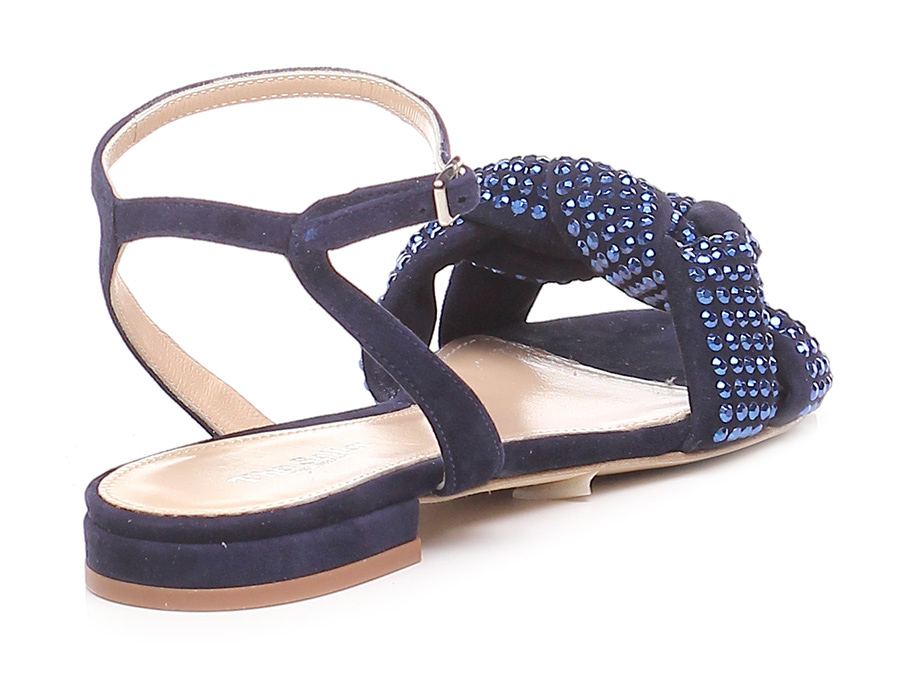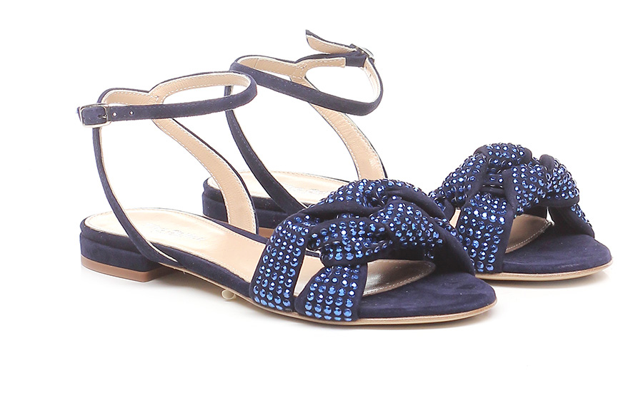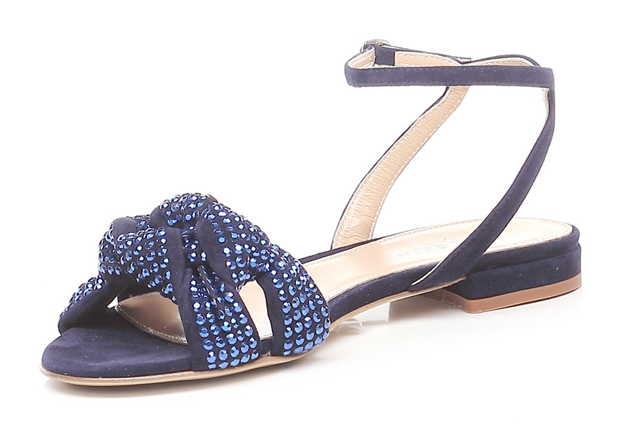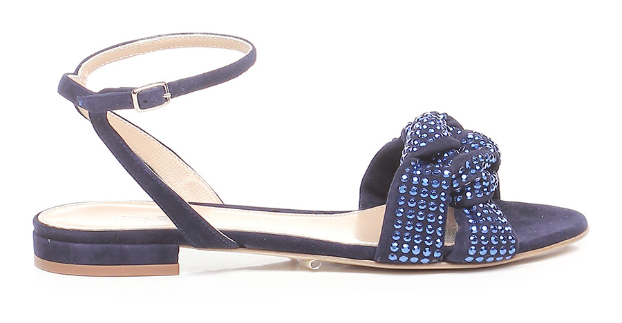Low suede sandal with ankle strap and front rhinestones, leather and rubber sole. Heel 20.
