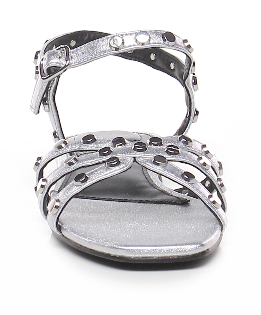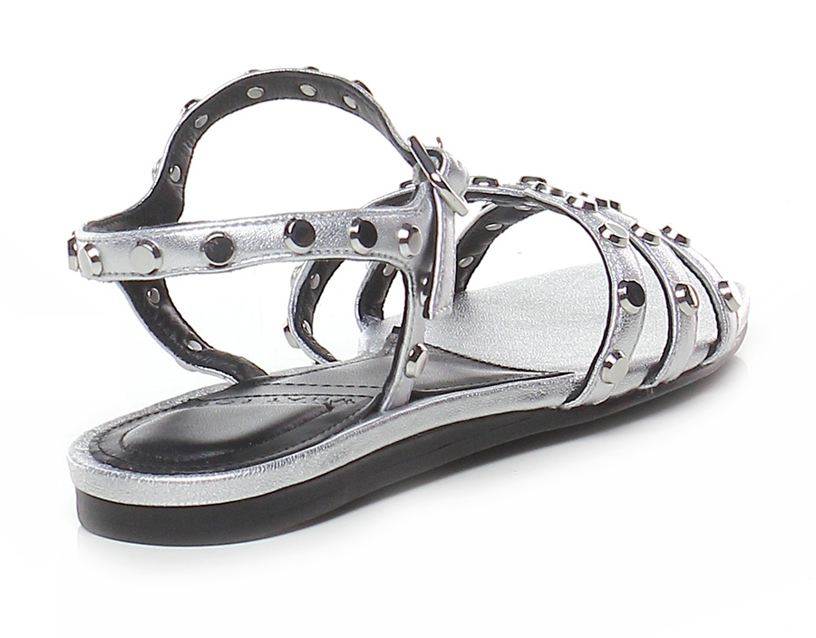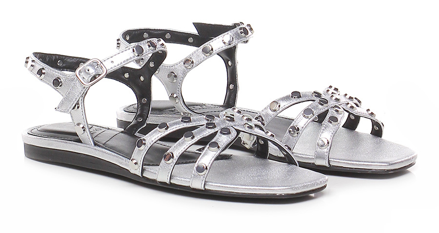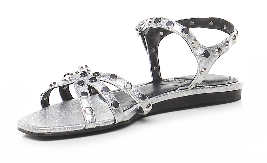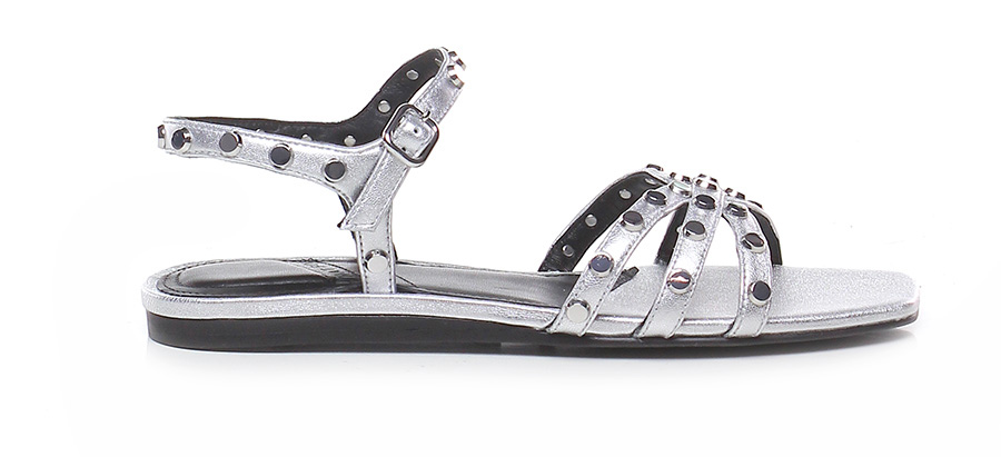 Flat sandal in laminated leather with ankle strap and studs on the upper, rubber sole. Heel 15.