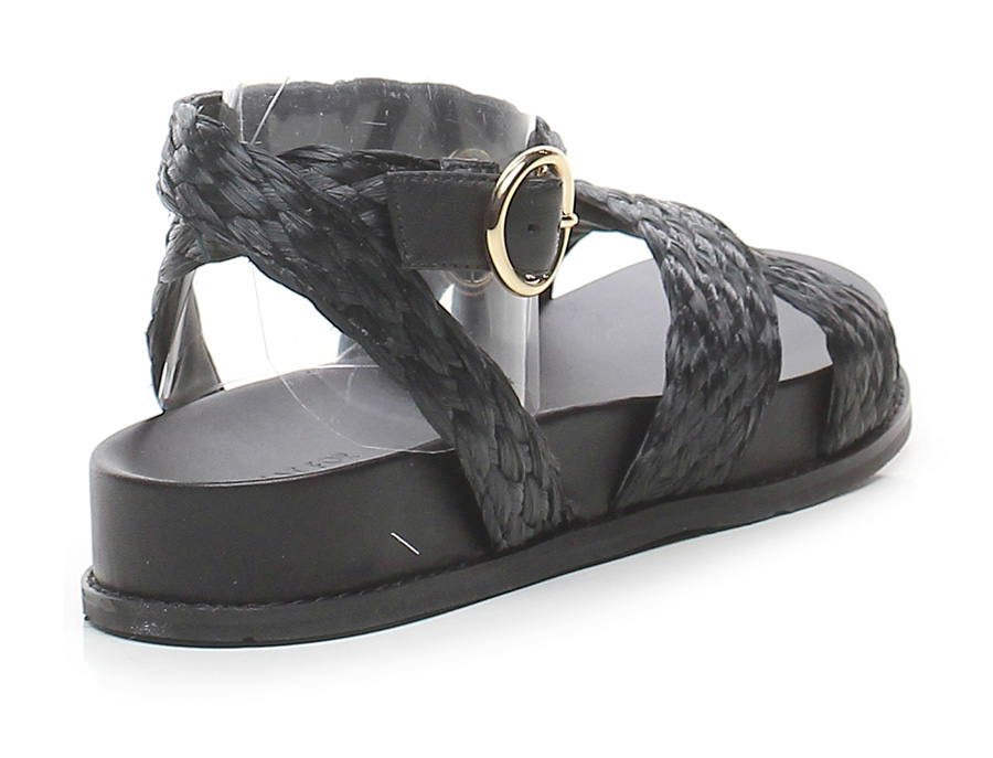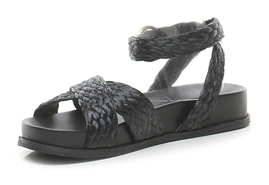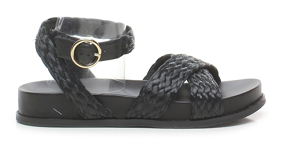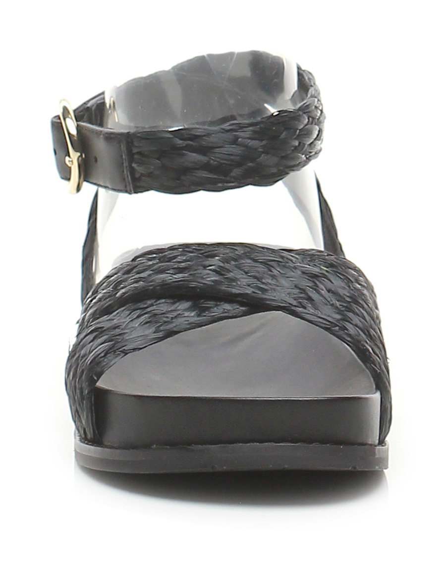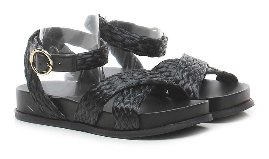 Flat sandal in woven raffia with ankle strap, rubber sole. Heel 30, platform 25 with ledge 5. Fussbett insole.