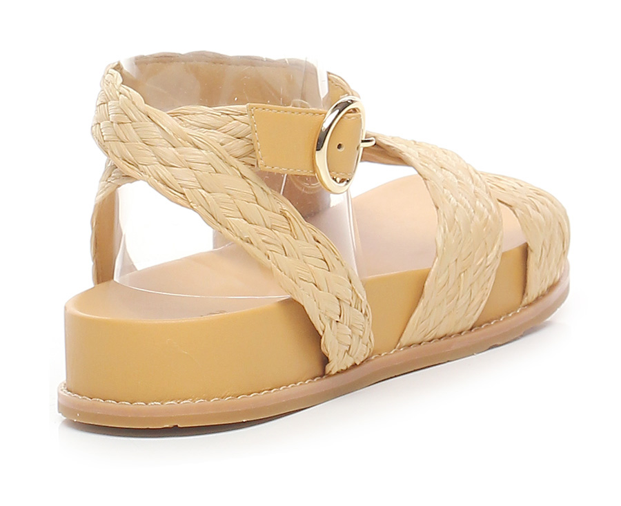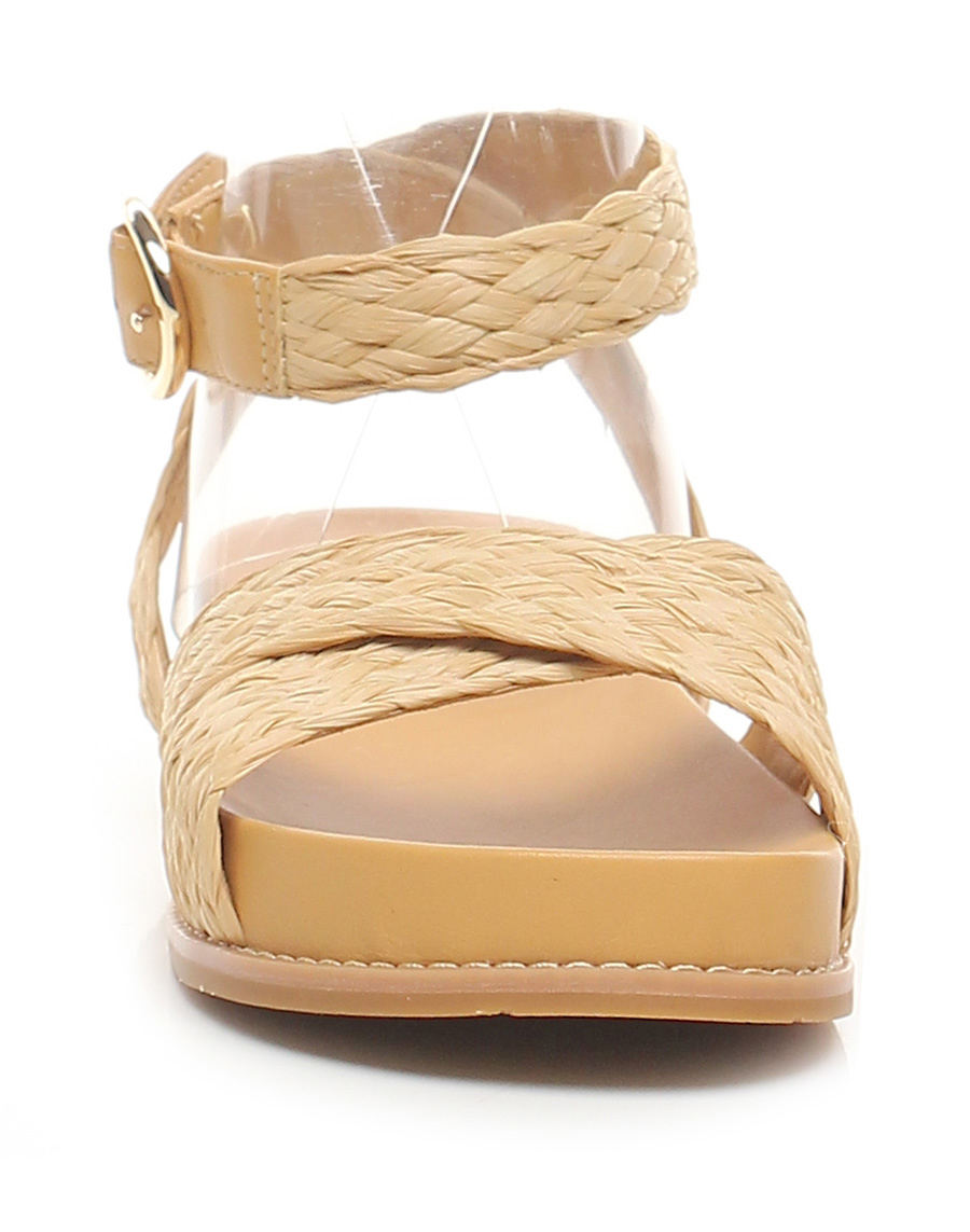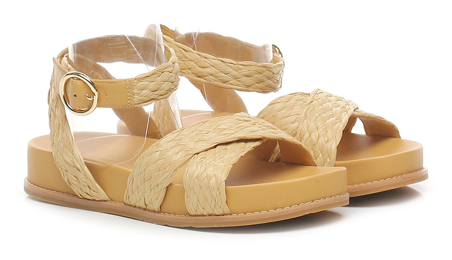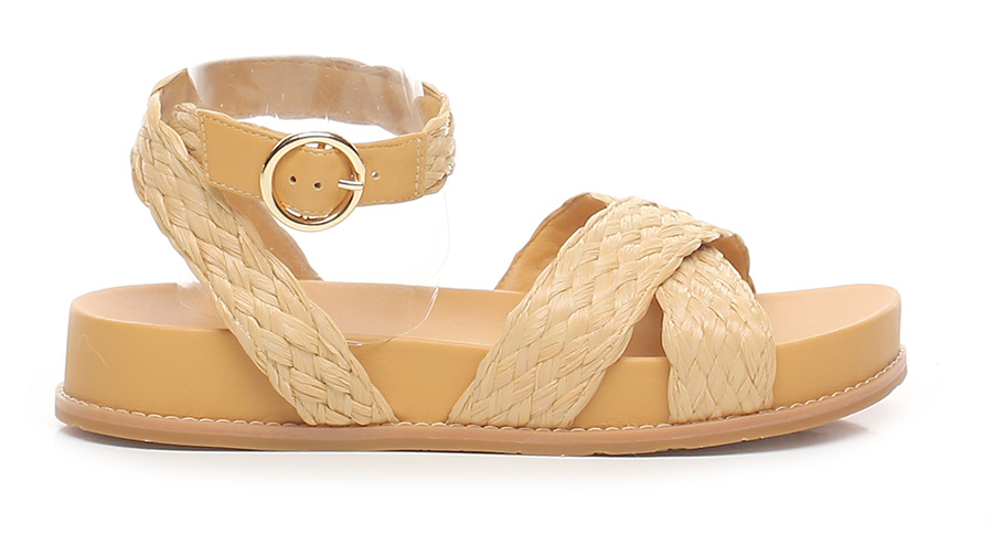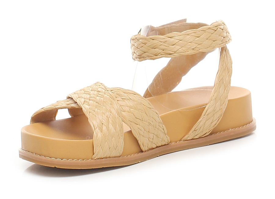 Flat sandal in woven raffia with ankle strap, rubber sole. Heel 30, platform 25 with ledge 5. Fussbett insole.