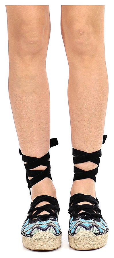 Low shoe in fabric with multi-stones on the upper and ankle fastening. Rubber sole, 35 heel, rope sole.