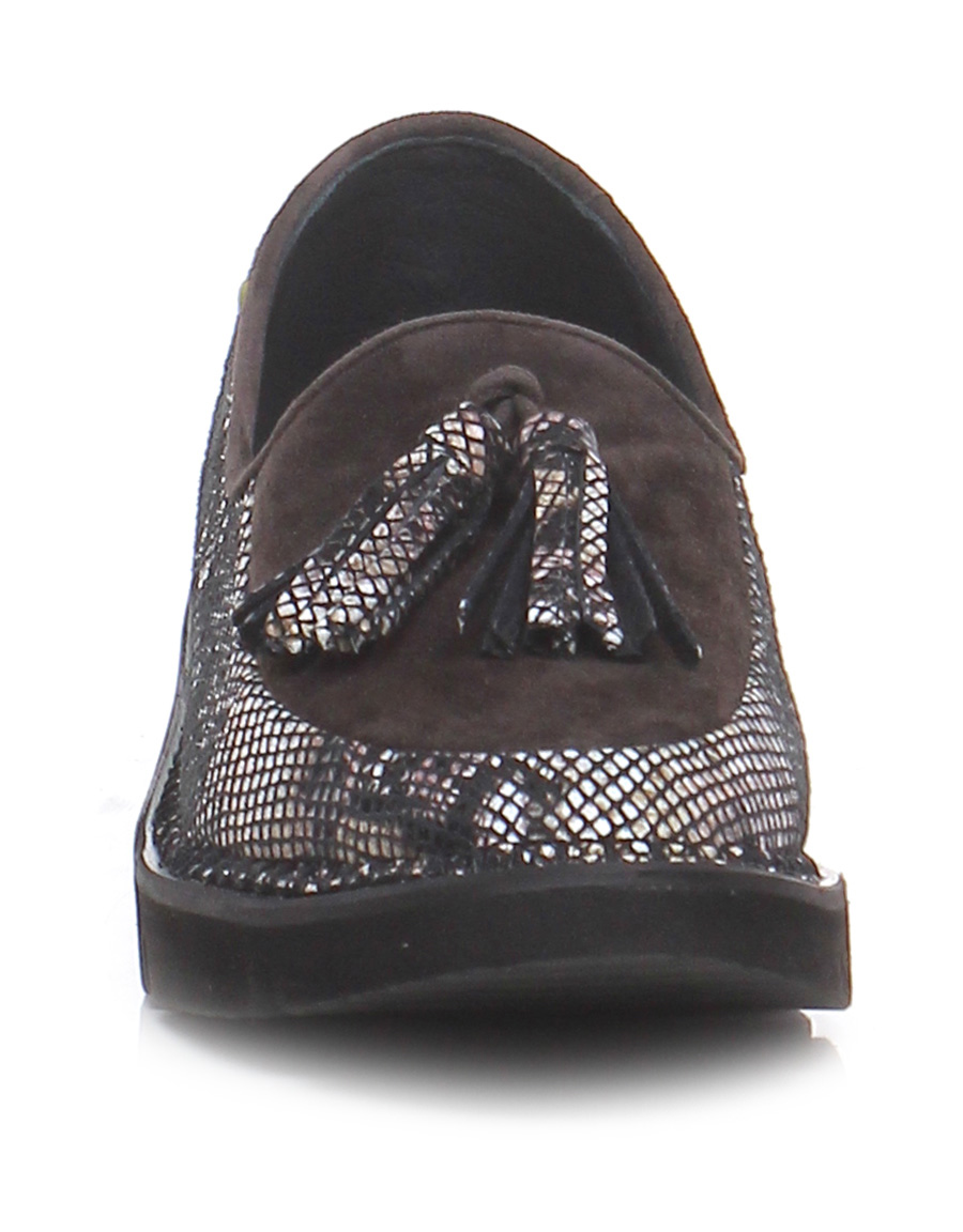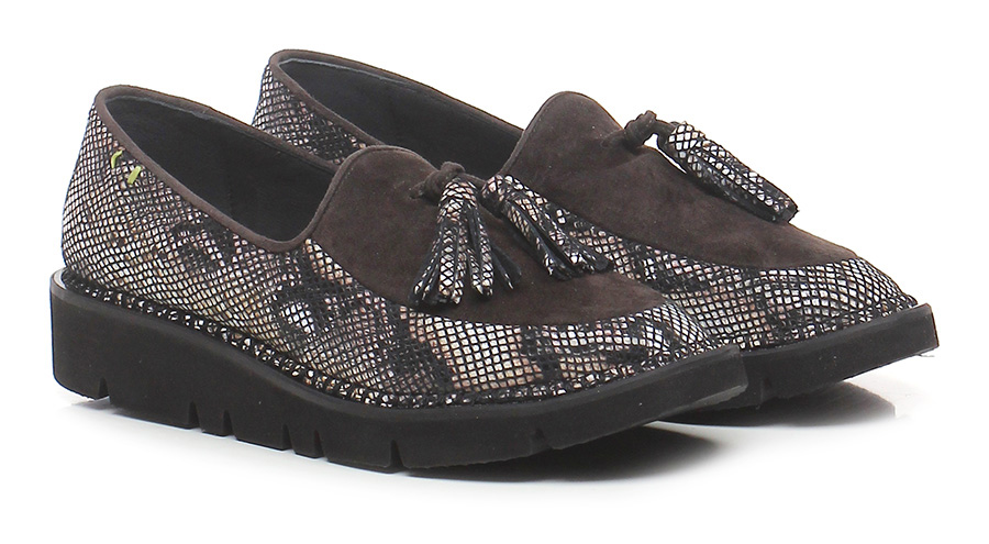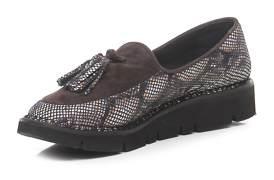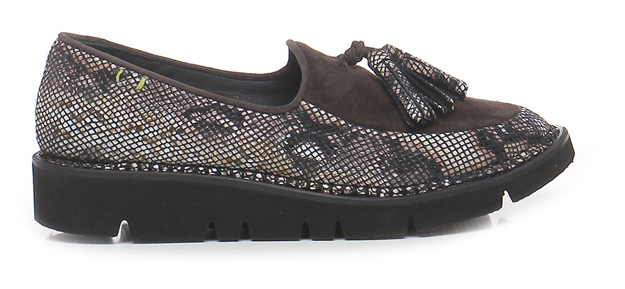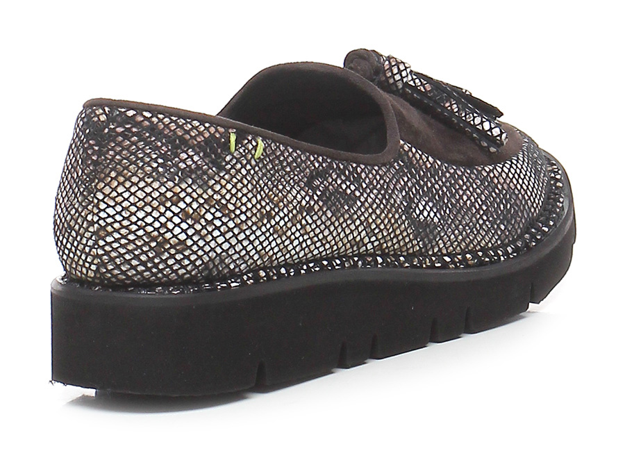 Low shoe in suede and python print leather with front tassels, light rubber sole. 30 heel, 20 platform with 10 bar.