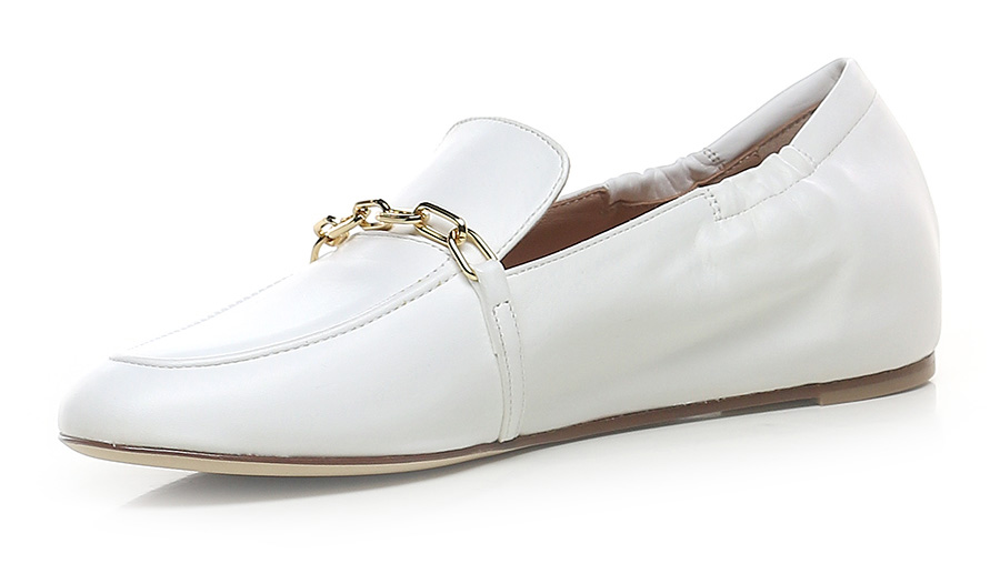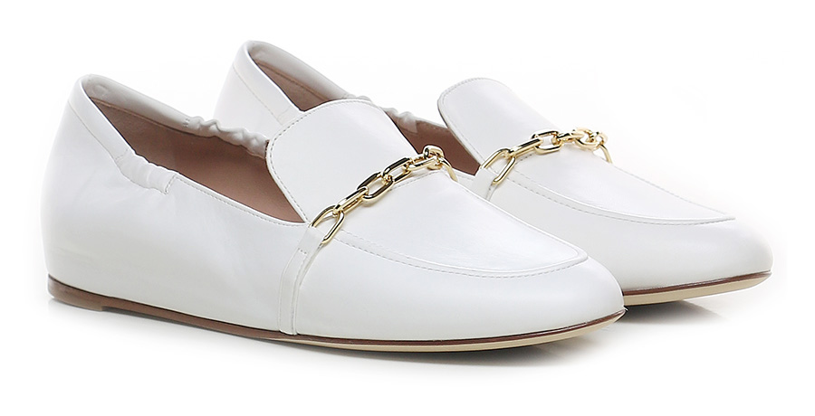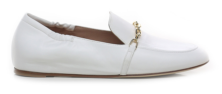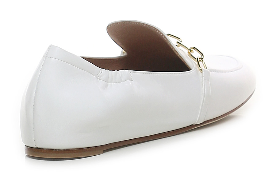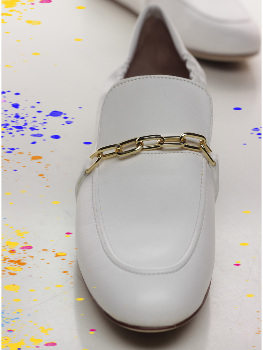 Leather shoe with frontal gold metal accessory. Leather and rubber sole.