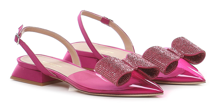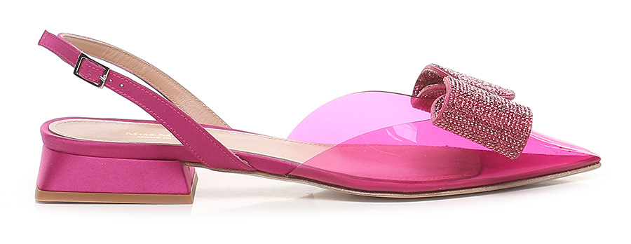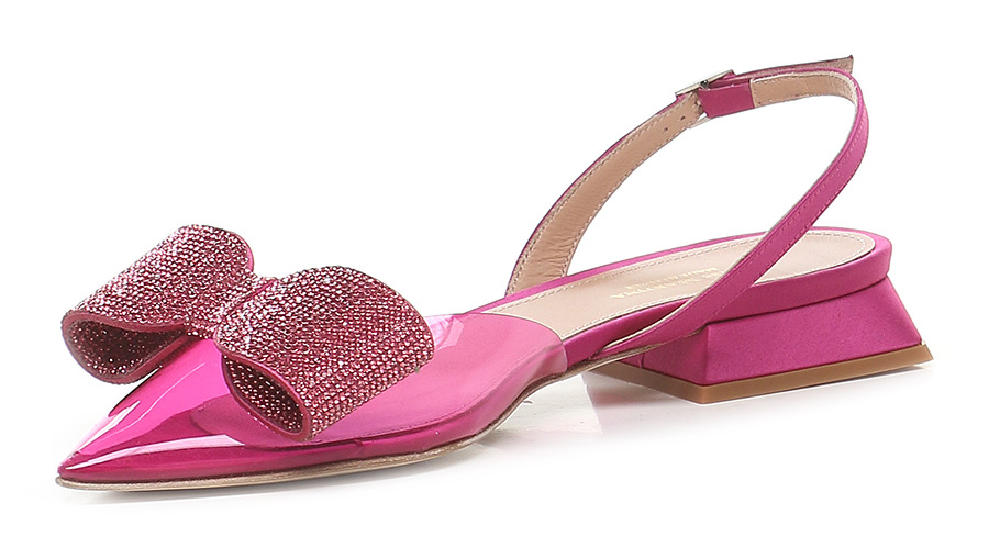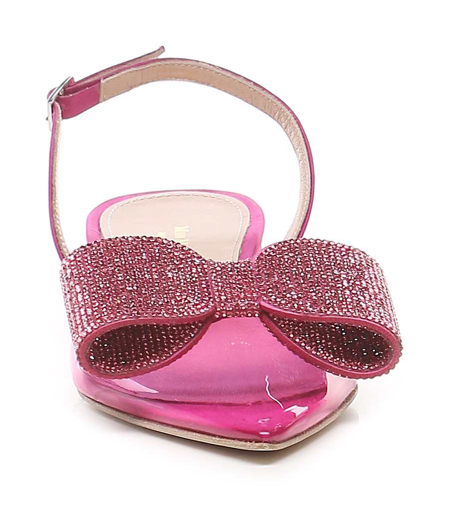 Satin and pvc shoe with back strap and maxi rhinestone bow on the front. Leather sole. Heel height 30mm. Satin lined heel.