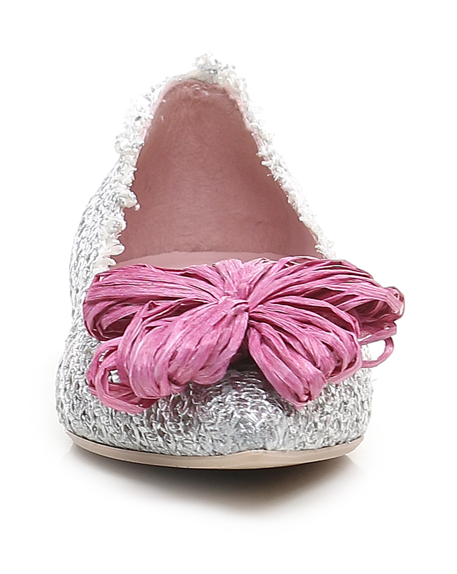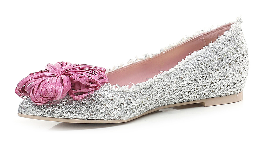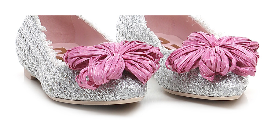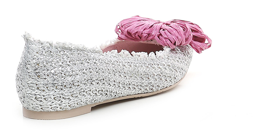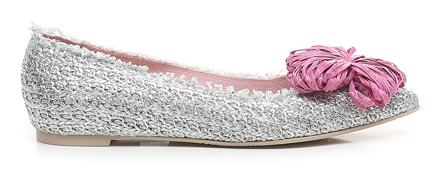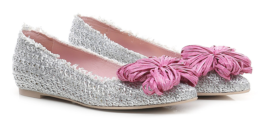 Shoe in laminated fabric with front accessory in fabric. Rubber sole.