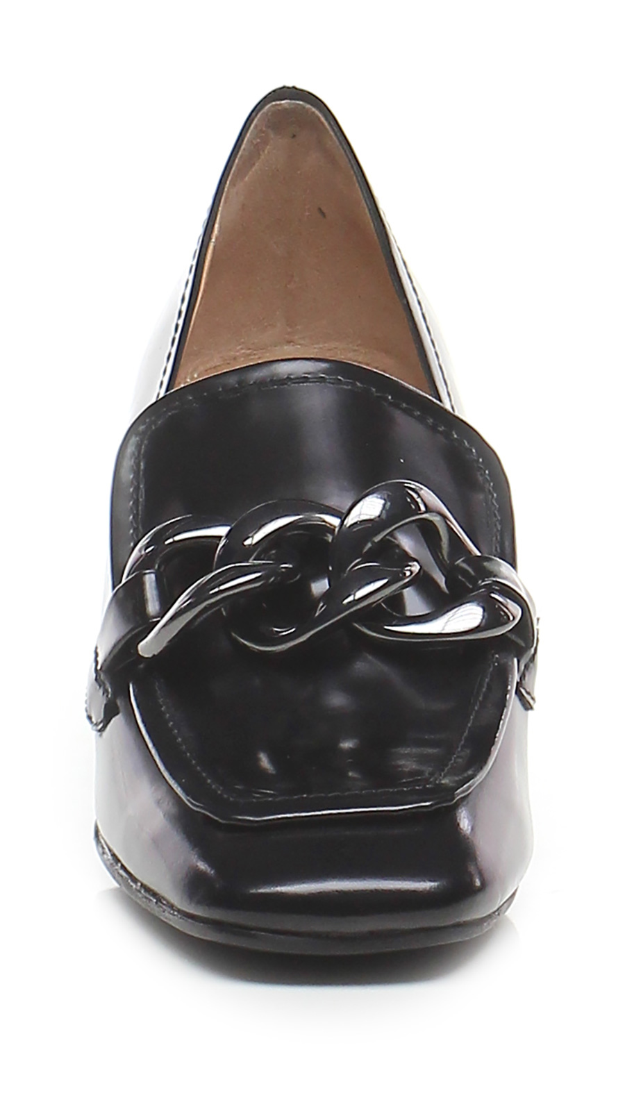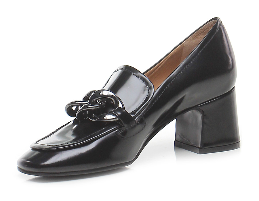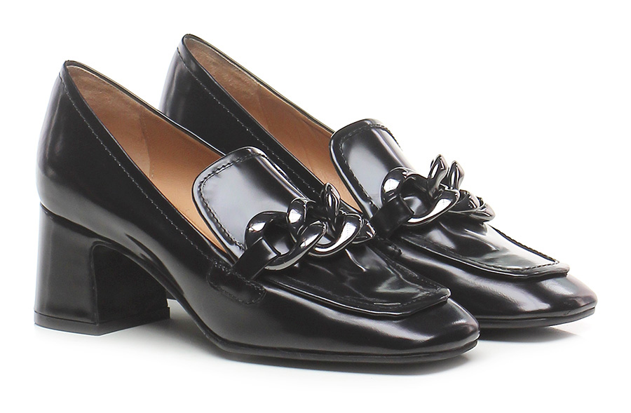 Heeled shoes in brushed leather with front chain insert, leather and rubber sole. Heel 60, covered in brushed leather.