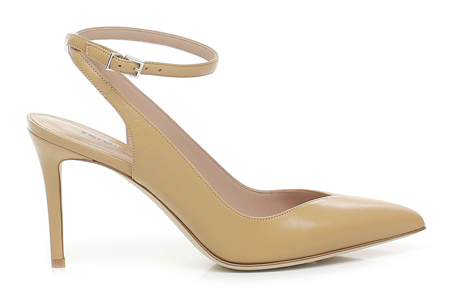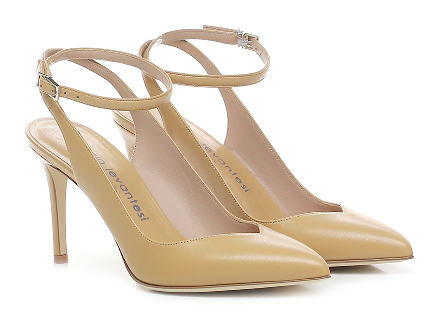 Leather heeled shoe with cross ankle strap, leather sole. 95 heel.