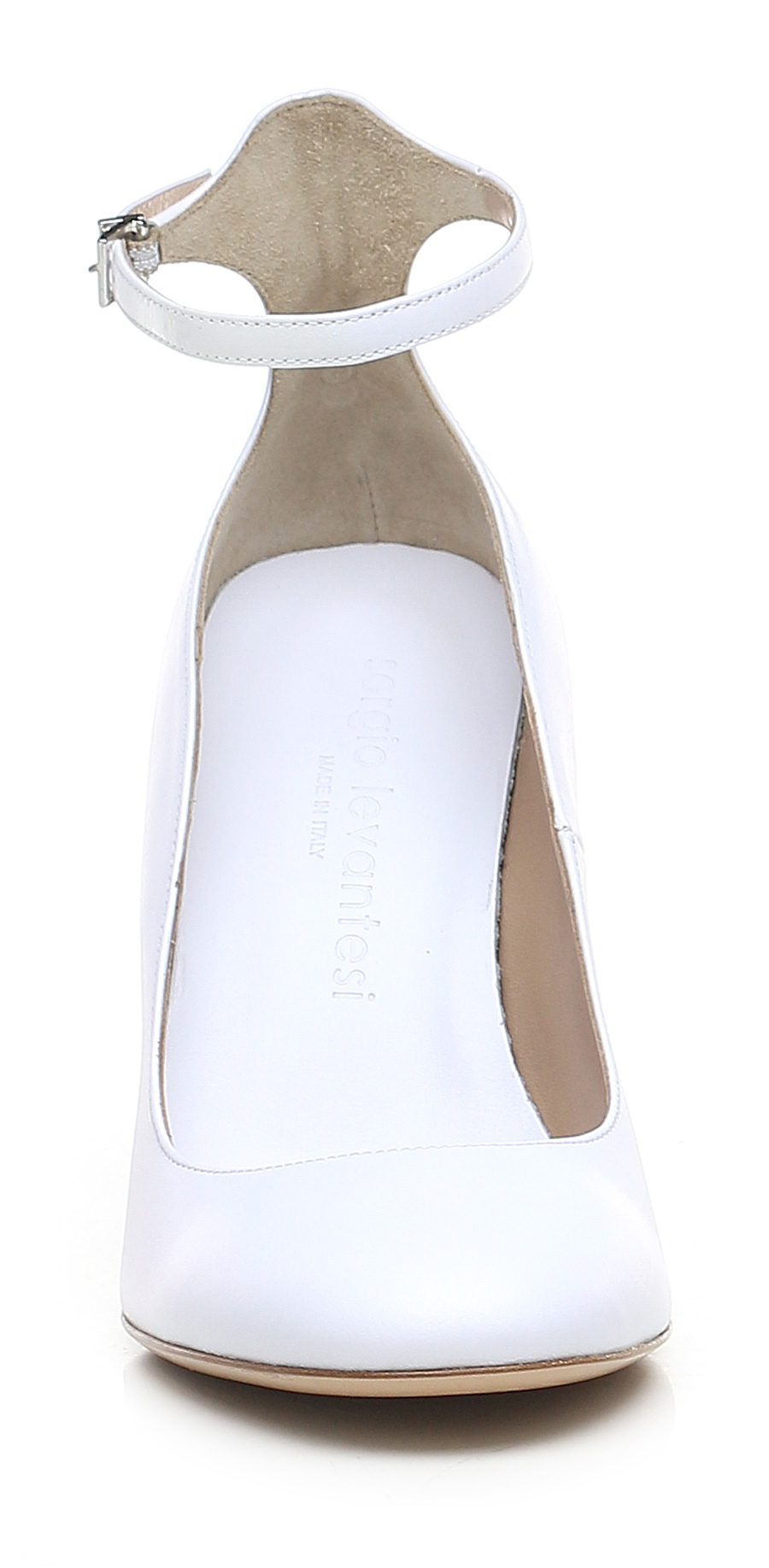 Leather shoe with ankle strap and leather sole. Heel height of 95mm. Patent lined heel.