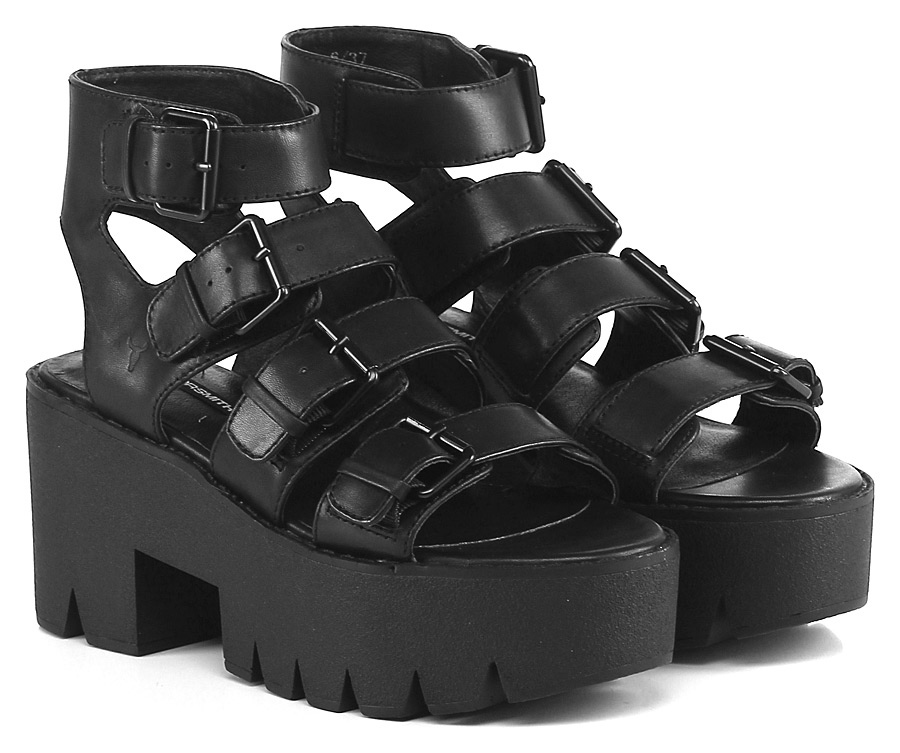 Sandalo alto in pelle con multi cinturino ed inserto elasticizzato su lato esterno. Suola in gomma, tacco 85, platform 50 con battuta 35.