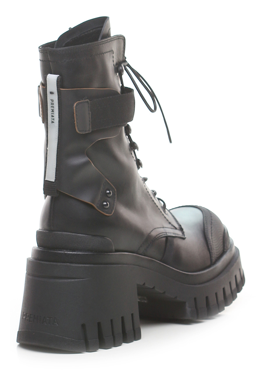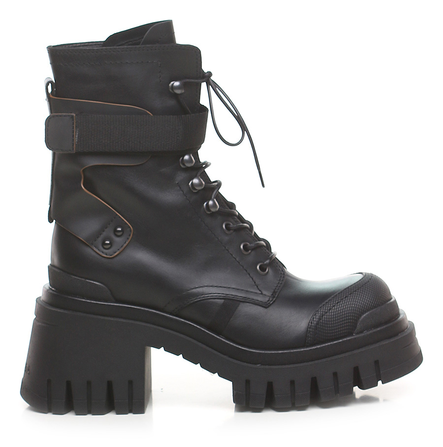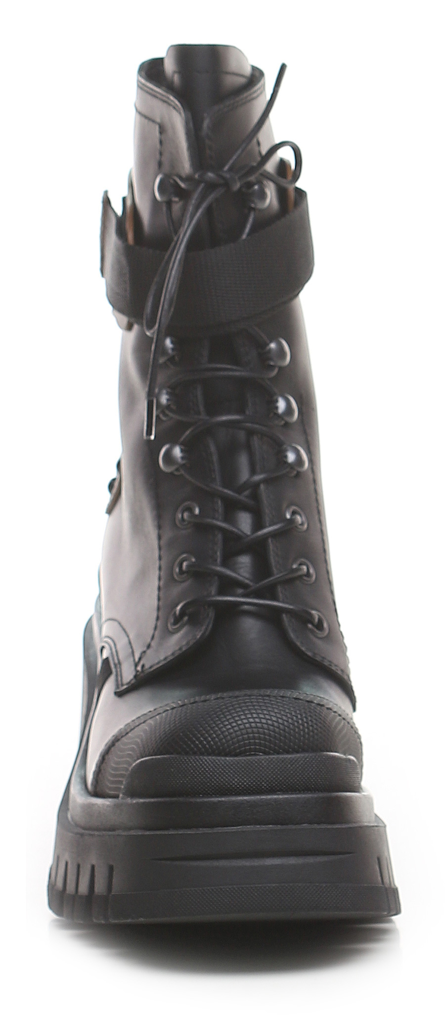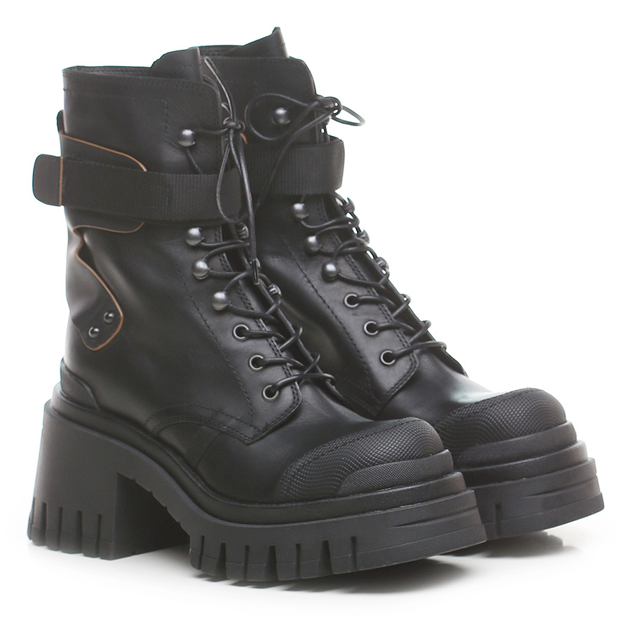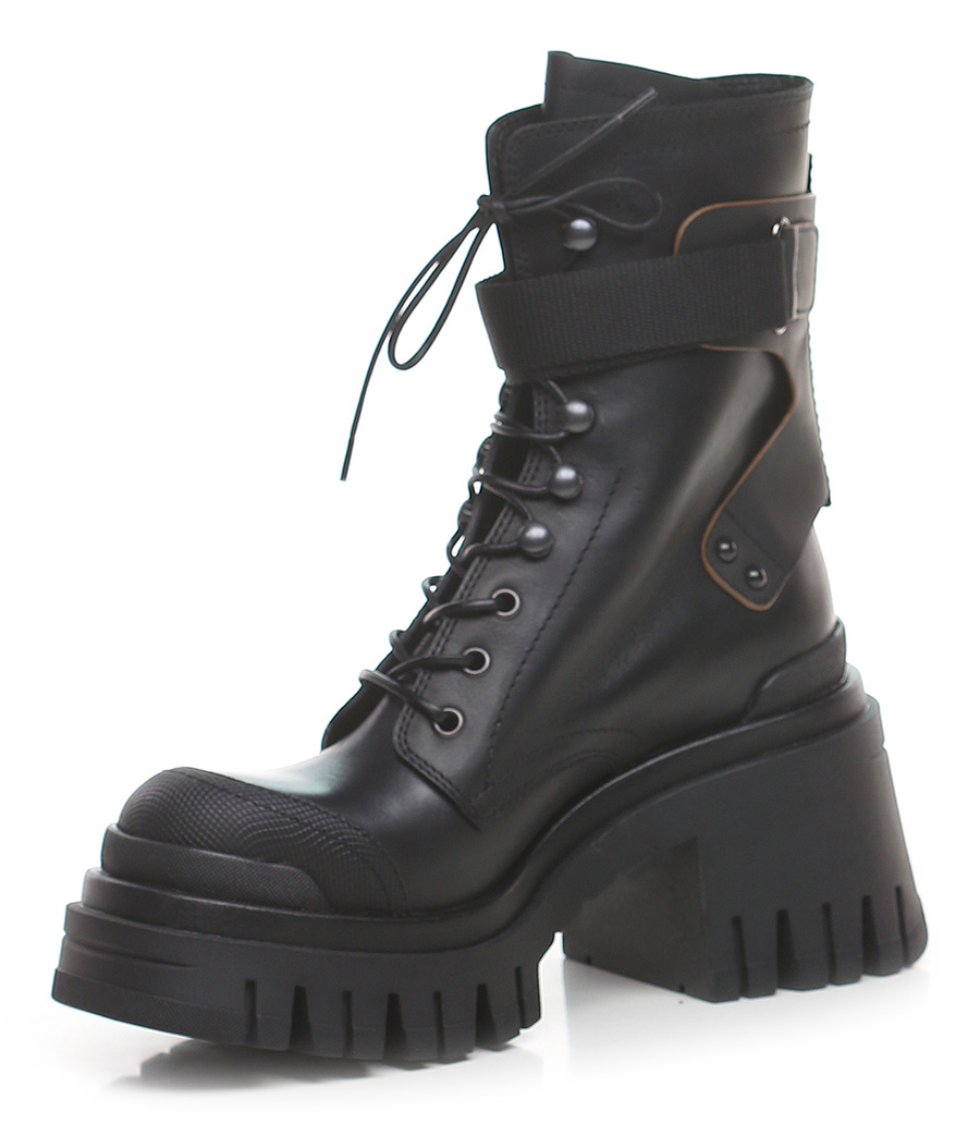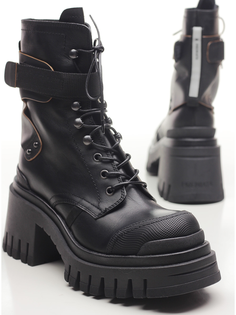 Leather ankle boot with front strap with velcro closure and rubber sole. Heel height 80mm, platform 40mm with 40mm ledge.