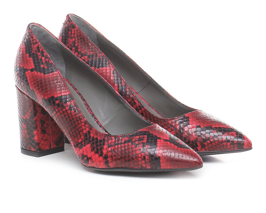 Decolletè in python print leather, rubber sole. Heel 85, platform 15 with ledge 70. Heel covered in python print leather.