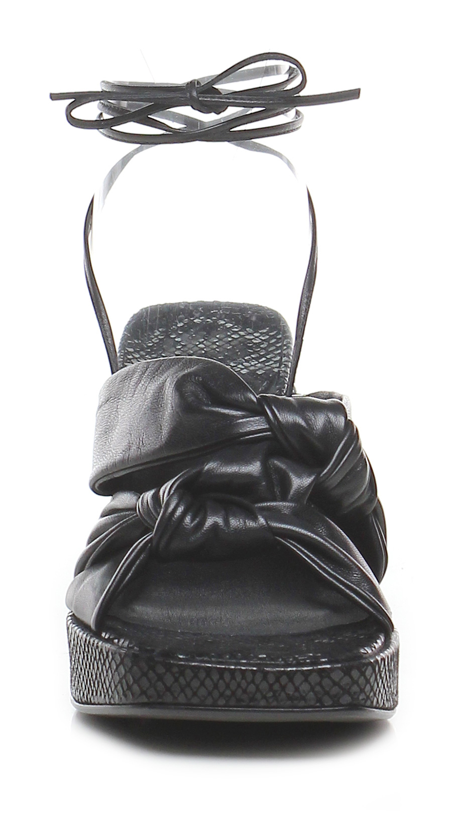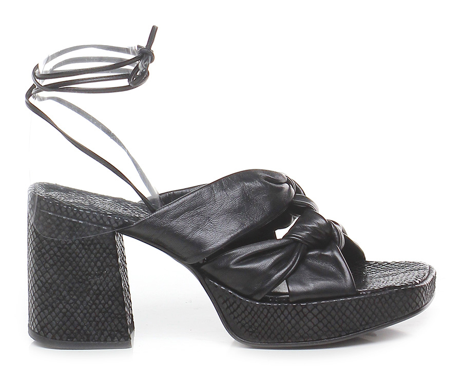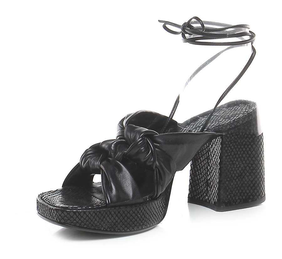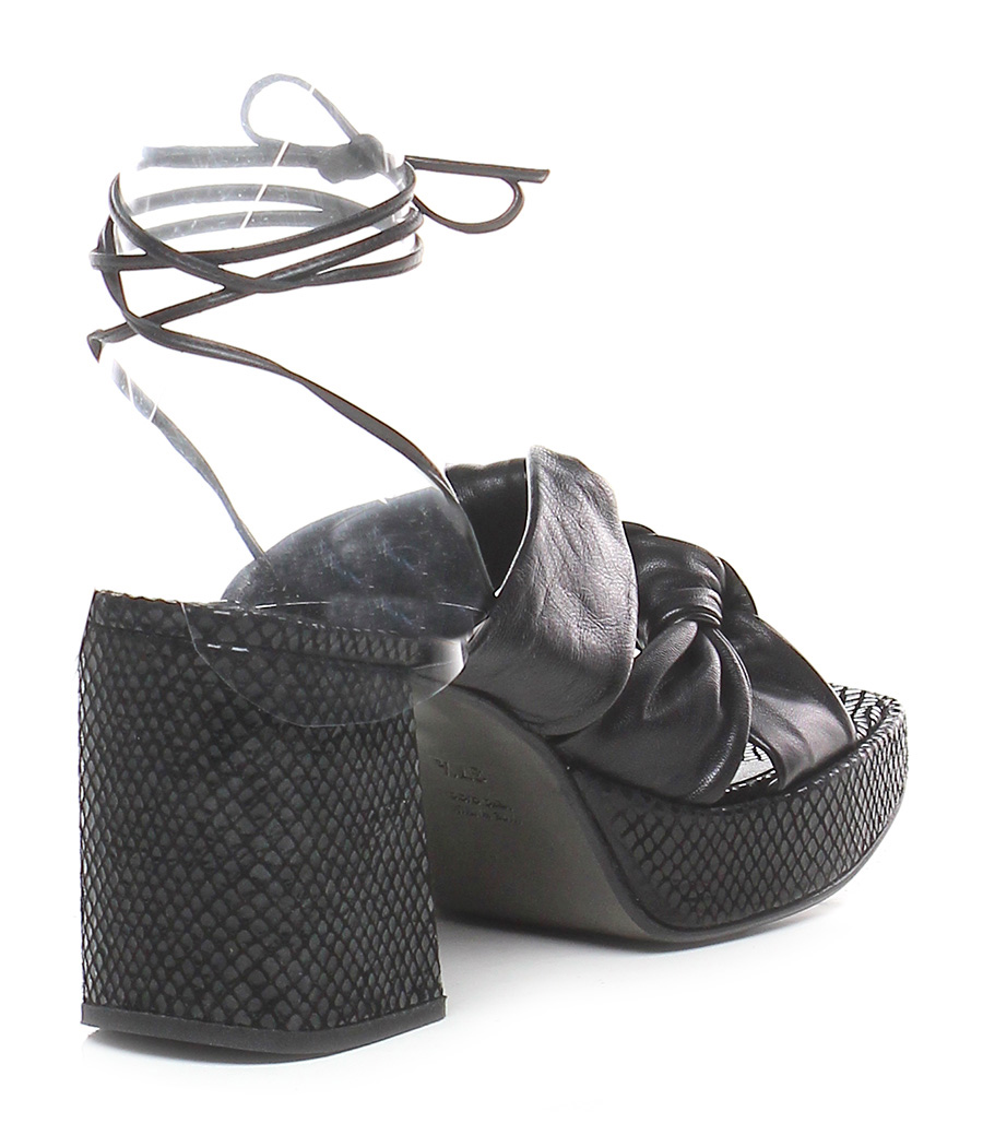 High sandal in python print leather with ankle lace closure, leather and rubber sole. 90 heel, 30 platform with 60 ledge. Platform and heel covered in python print leather.