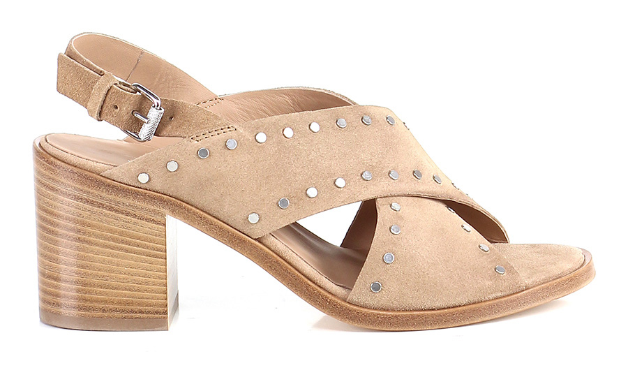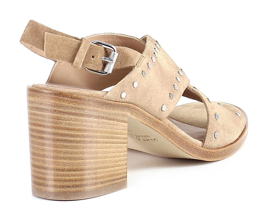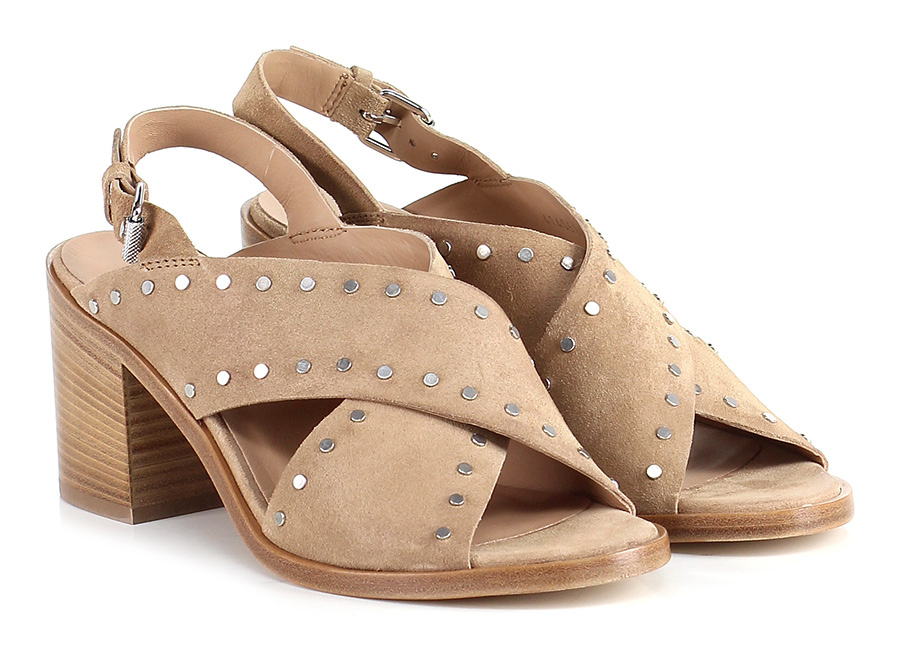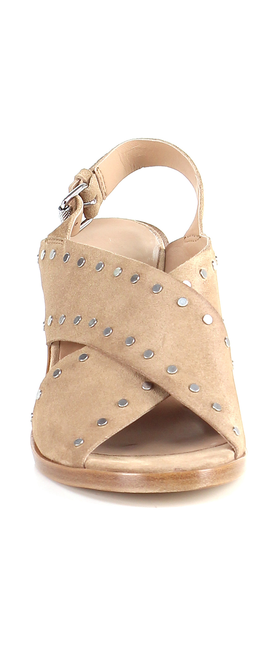 High suede sandal with strap on the back and studs on the upper. Leather sole, 80 heel.