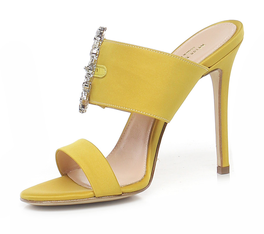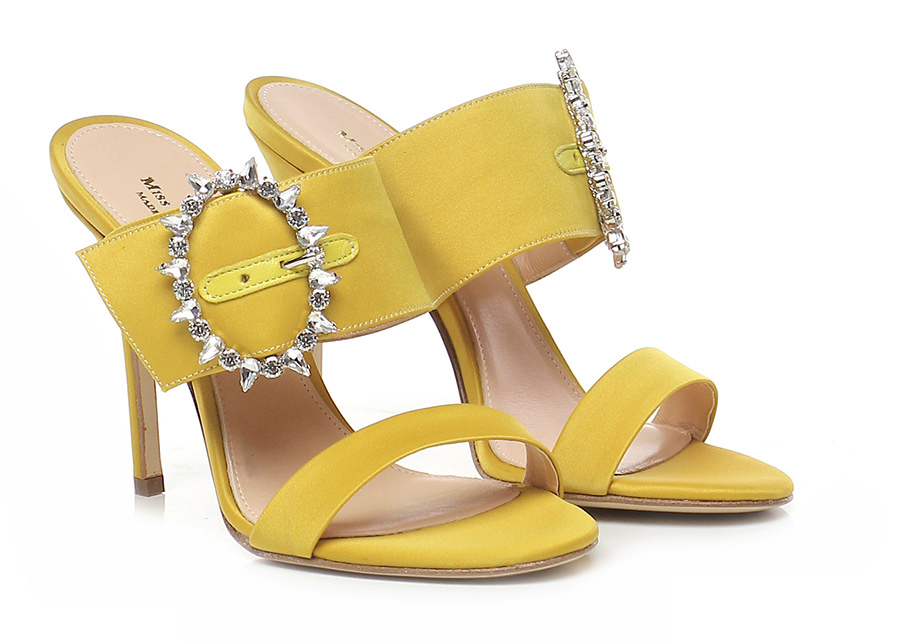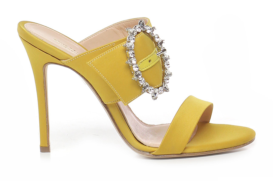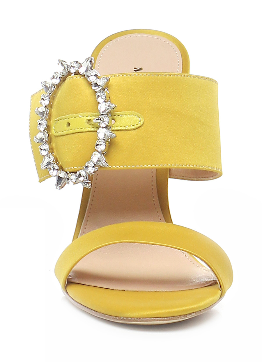 High sandal in satin fabric with front strap, rhinestone and stone buckle, leather sole. 115 heel.