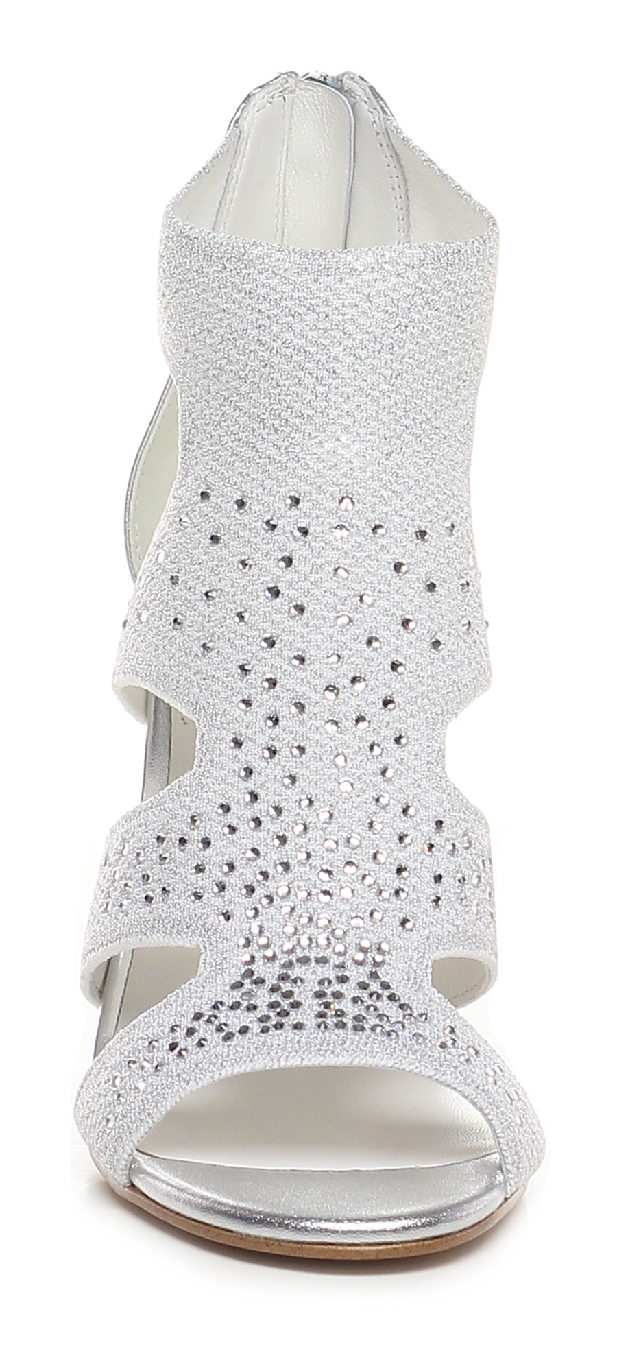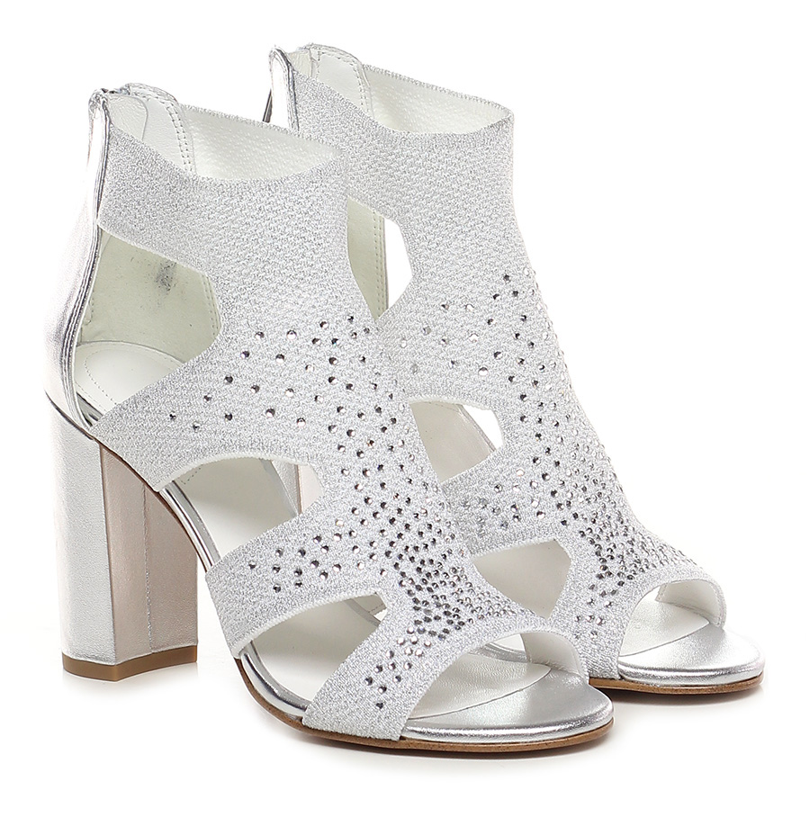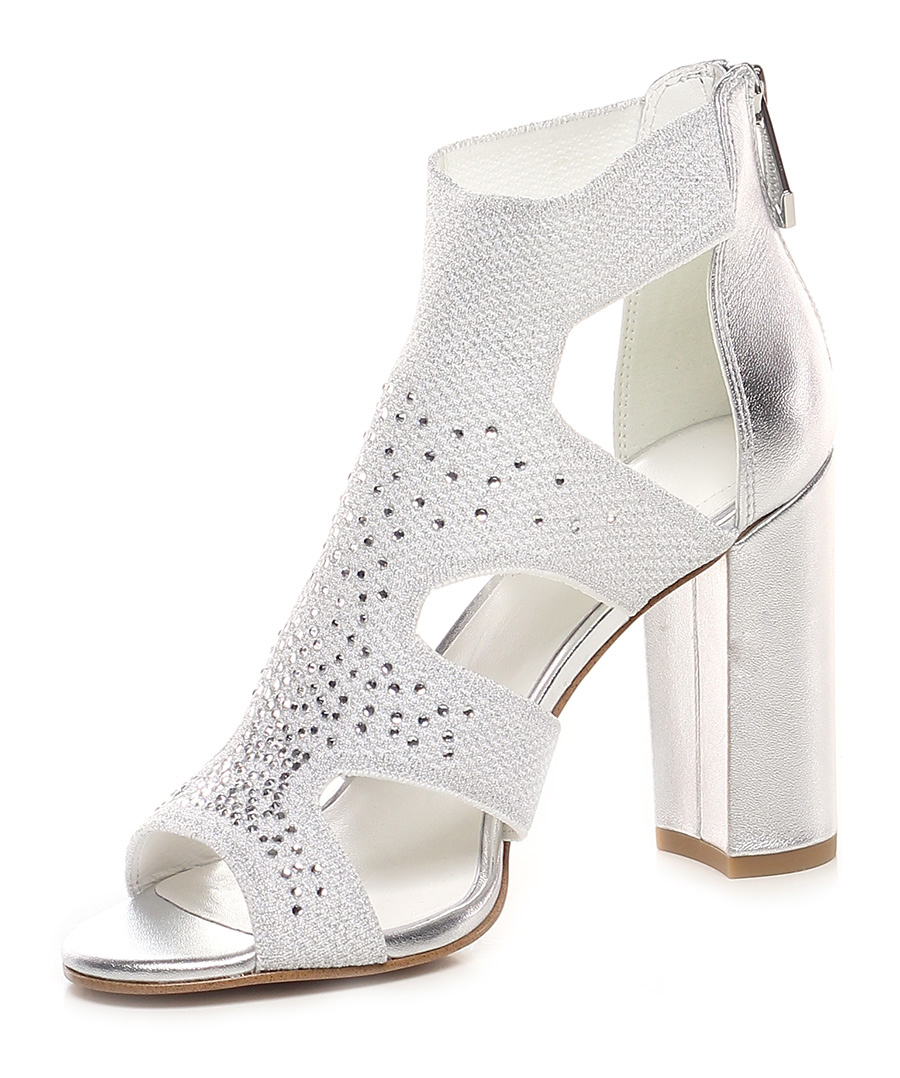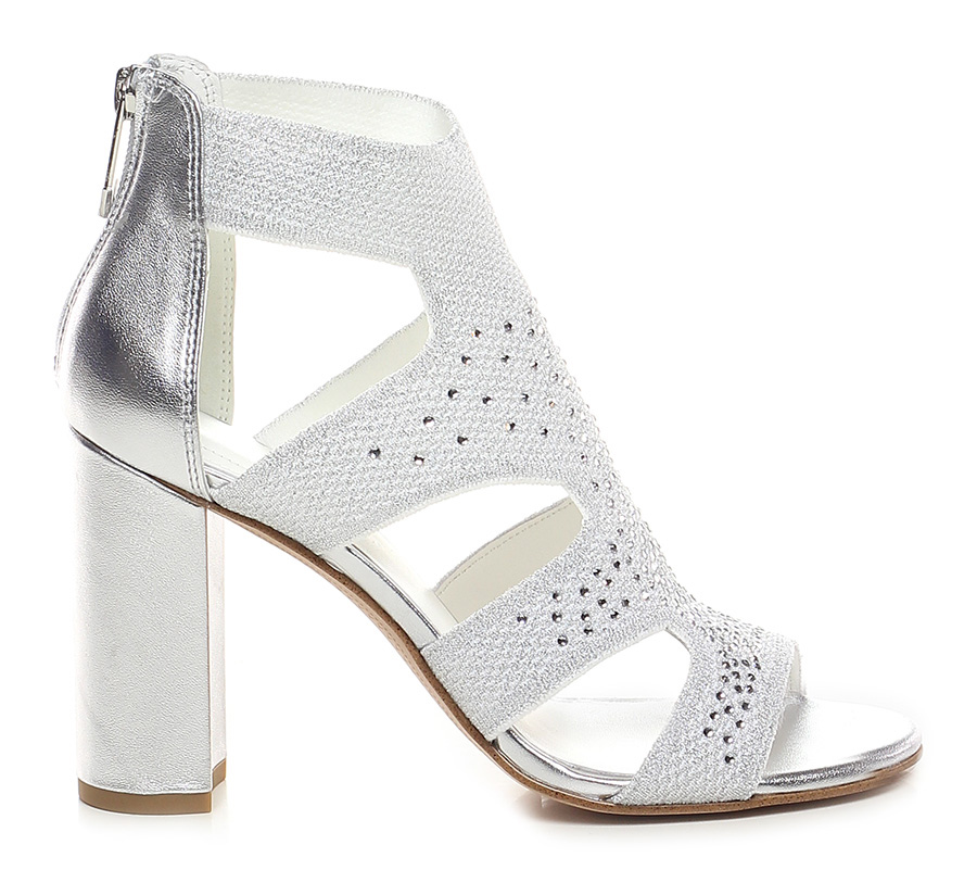 High sandal in stretch fabric with rhinestones on the upper and laminated leather. Rubber sole and zip on the back. Heel lined in 100 laminated leather.