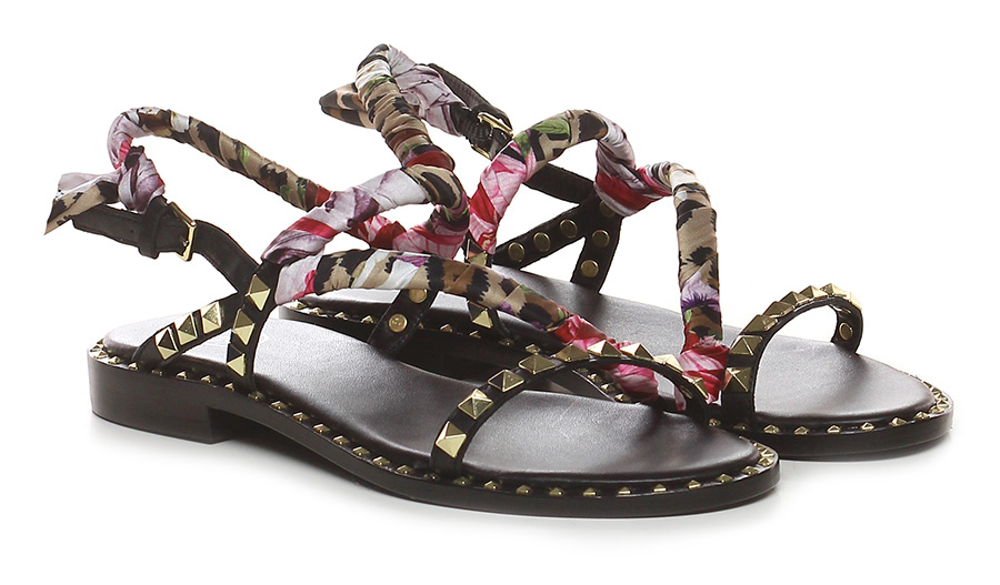 Sandalo basso in pelle con borchie gold e tessuto fantasy, cinturino su retro. Suola in cuoio, tacco 20.