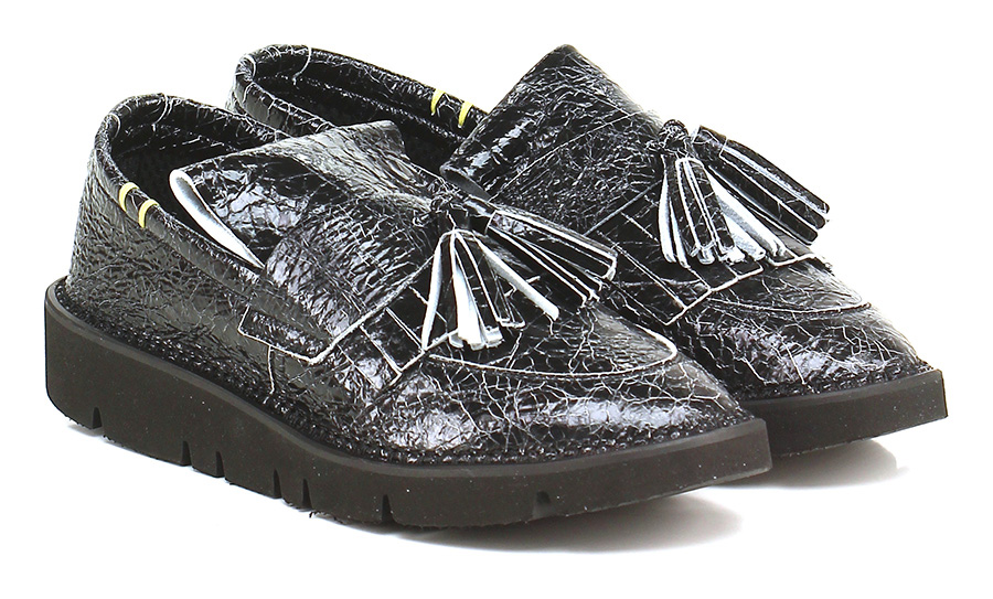 Scarpa bassa in pelle effetto crack con pattella frontale con frange e nappine. Suola in gomma light, tacco 40, platform 25 con battuta 15.