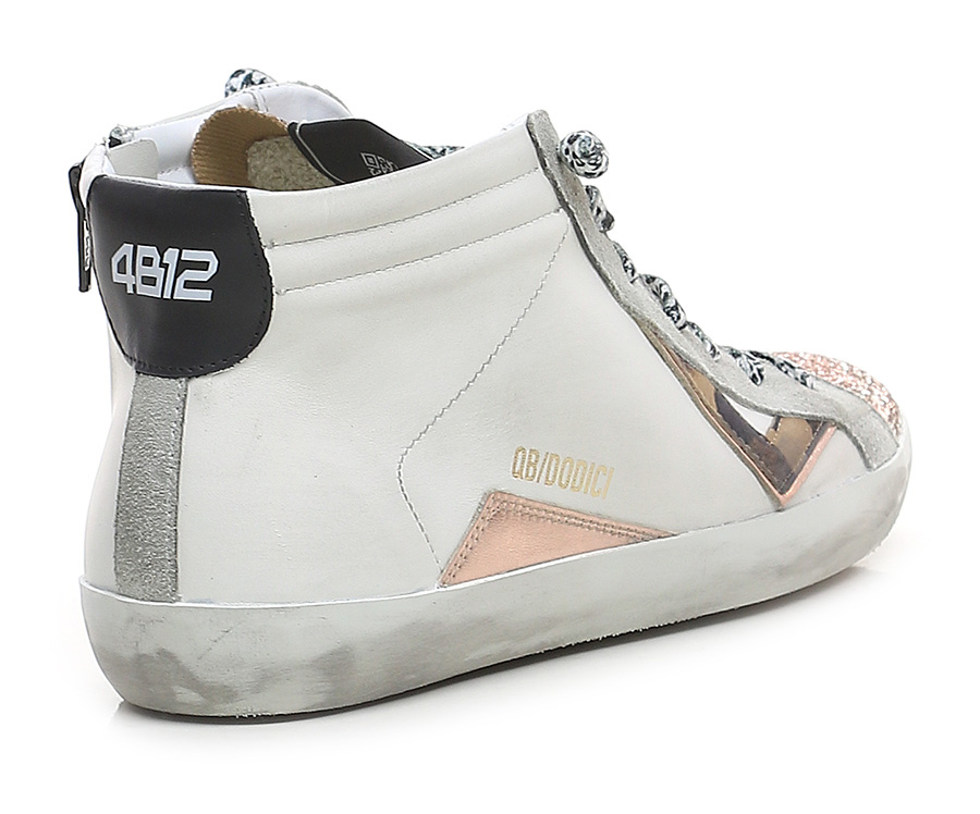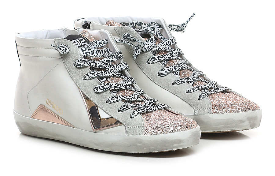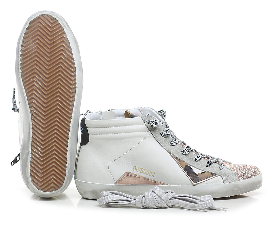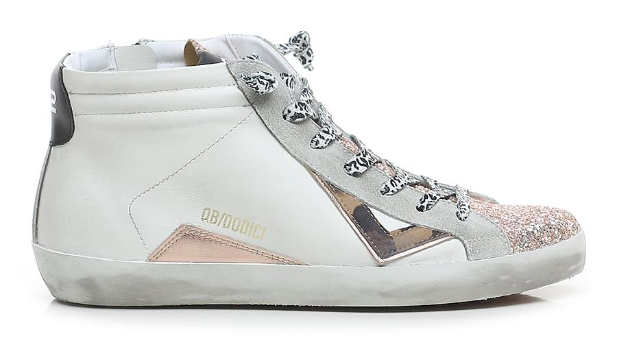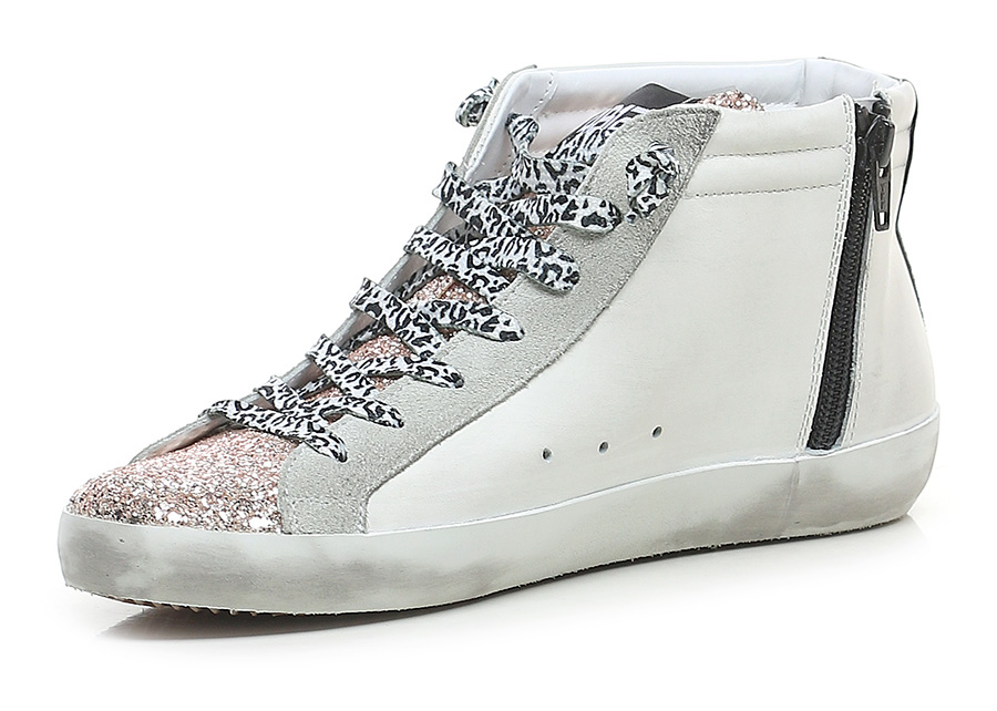 Sneaker in vintage effect leather, vintage effect suede and glitter with side laminated leather insert. Side zip. Vintage effect rubber sole. 25mm heel height, 20mm platform with 5mm ledge.