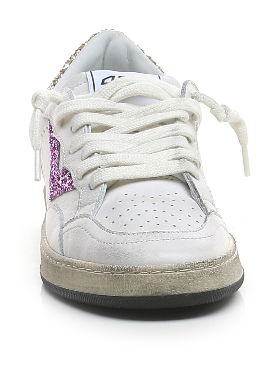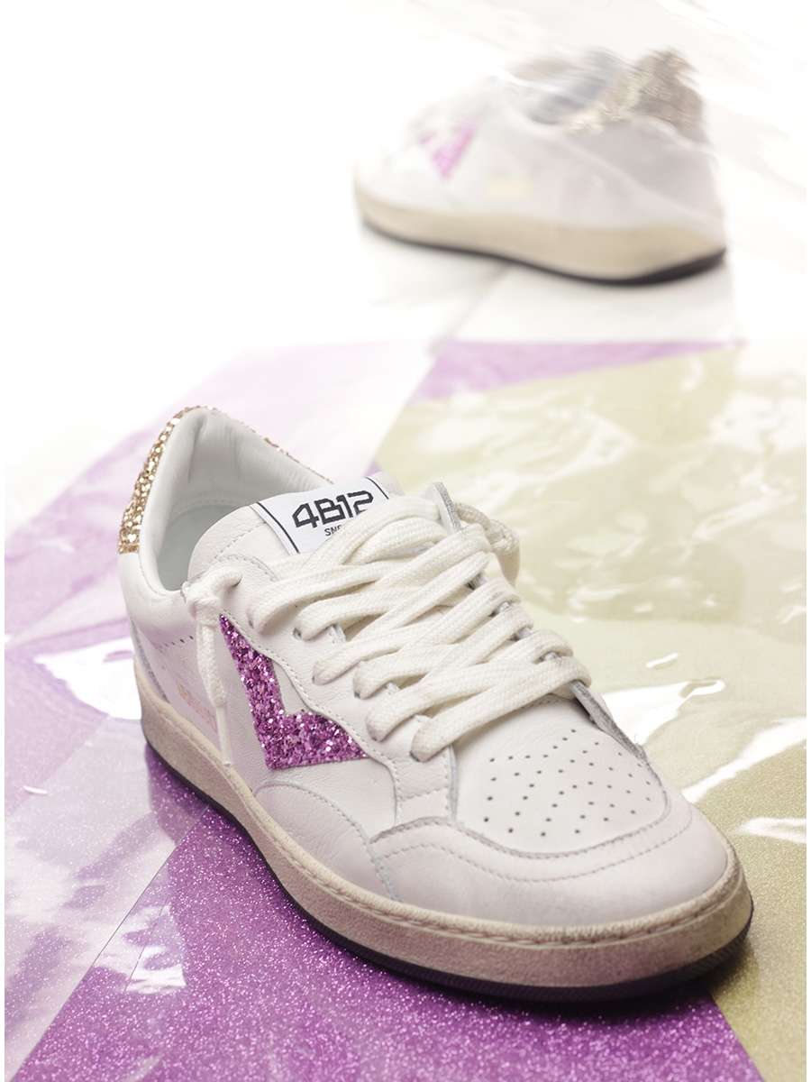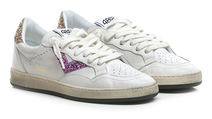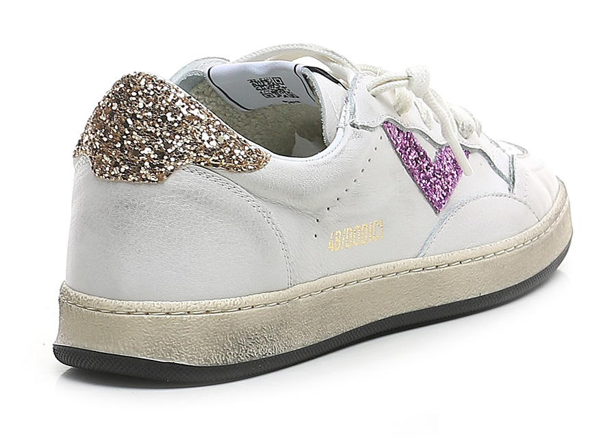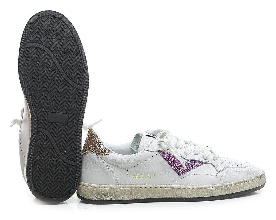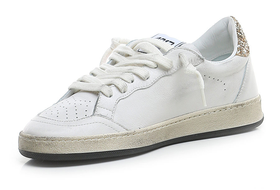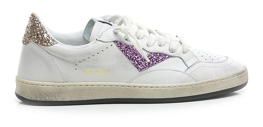 Vintage-effect leather sneaker with glitter inserts. Rubber sole. Heel height 30mm, platform 20mm with 10mm ledge.