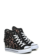 Sneaker in eco pelle, tessuto e paillettes con suola in gomma. Tacco 30, zeppa interna 65.