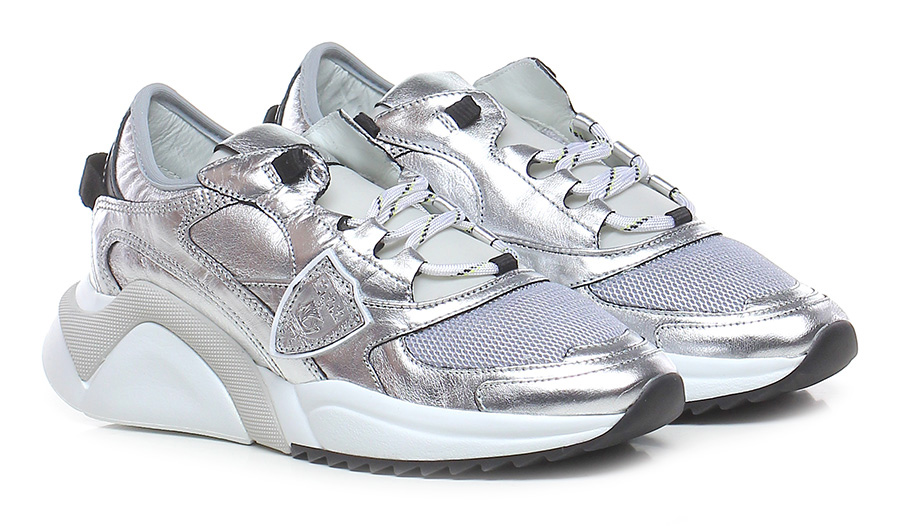 Sneaker in pelle e tessuto tecnico a rete con inserti in pelle specchiata. Suola in gomma over size. Altezza suola: 45, platform 30 con battuta 15.