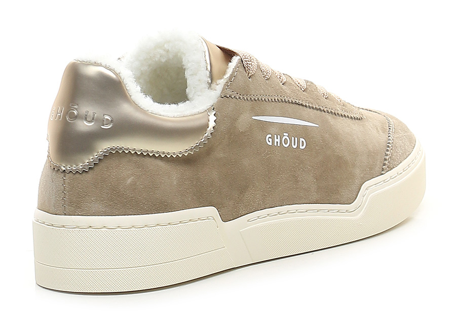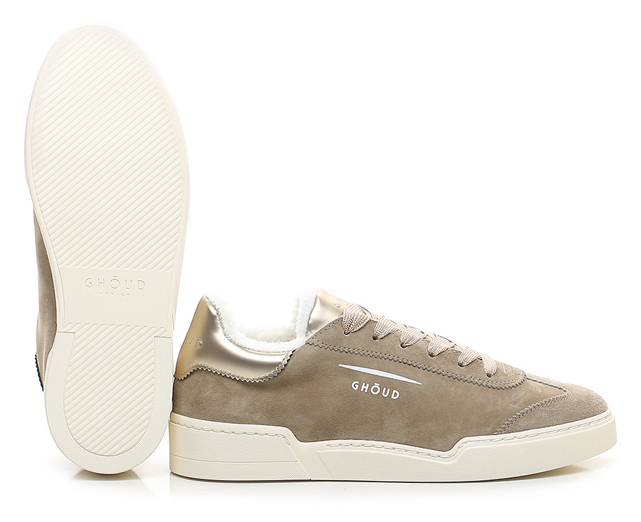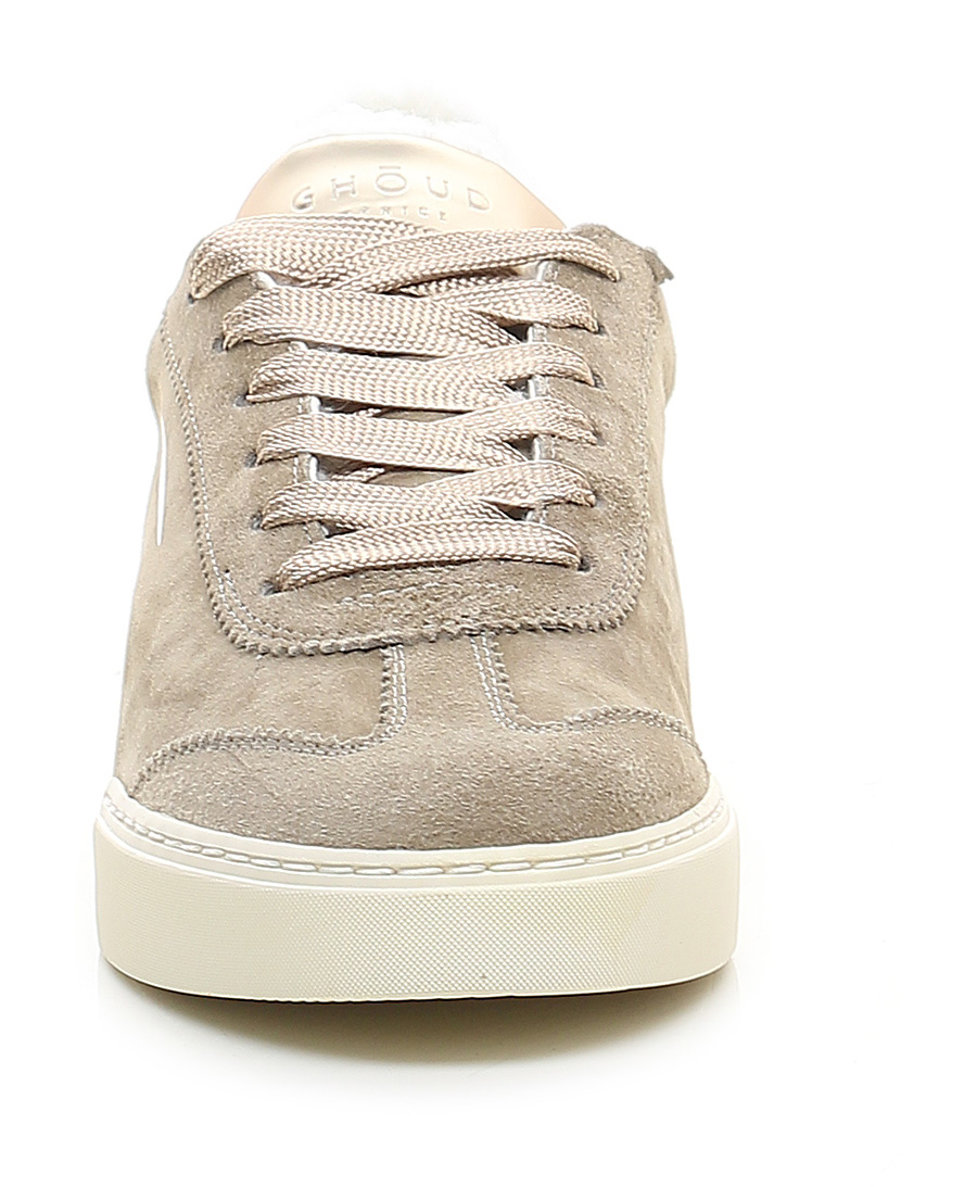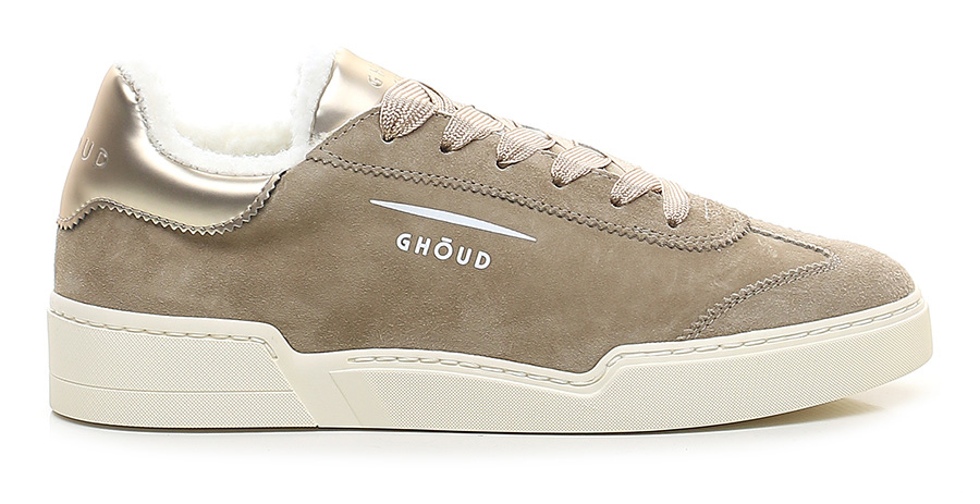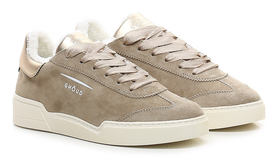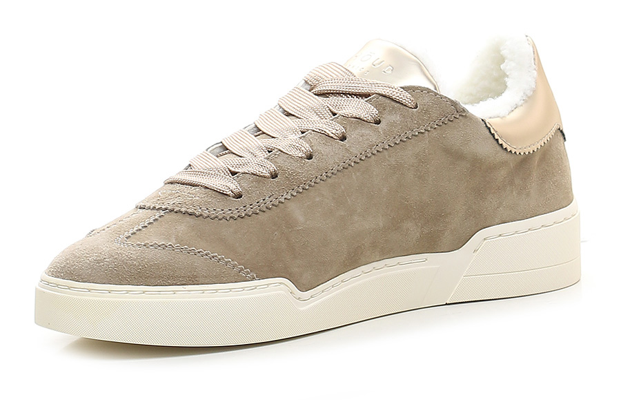 Suede sneaker lined in shearling. Rubber sole. Heel height 35mm, platform 20 with 15mm ledge.