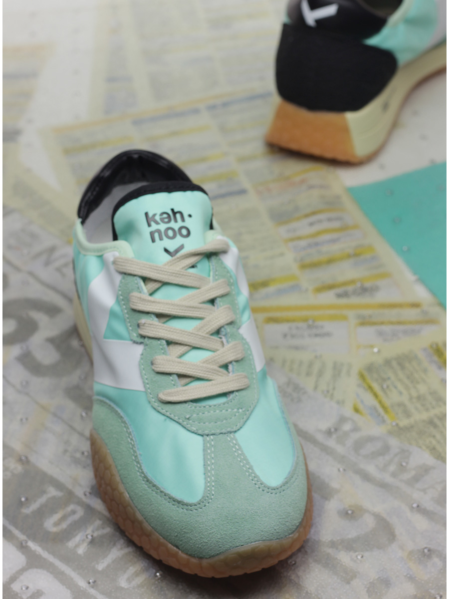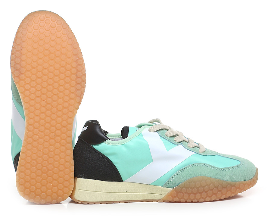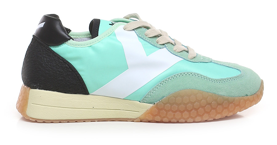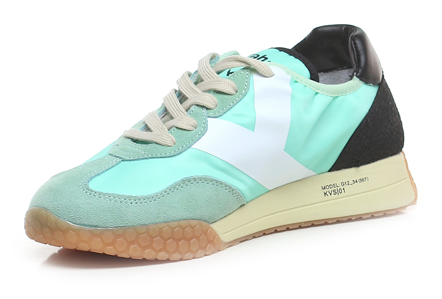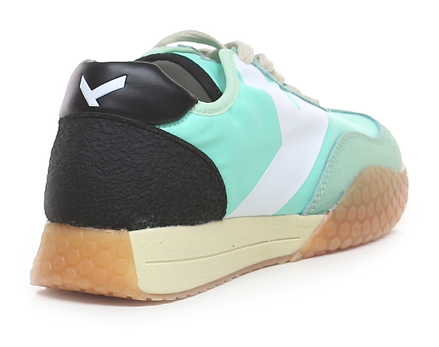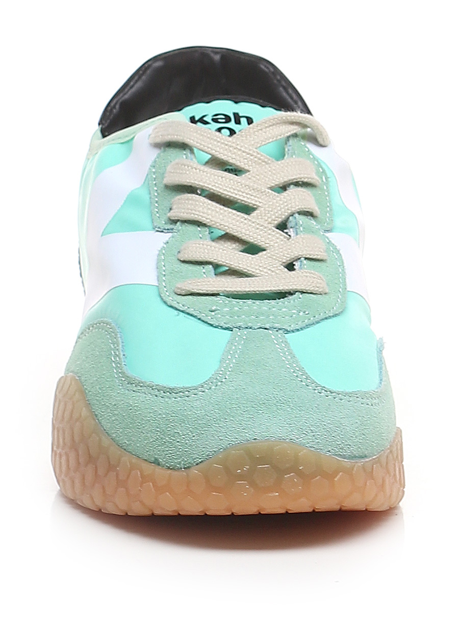 Fabric and suede sneaker with pvc heel tab and rubber sole. 35mm heel height, 20mm platform with 15mm ledge.