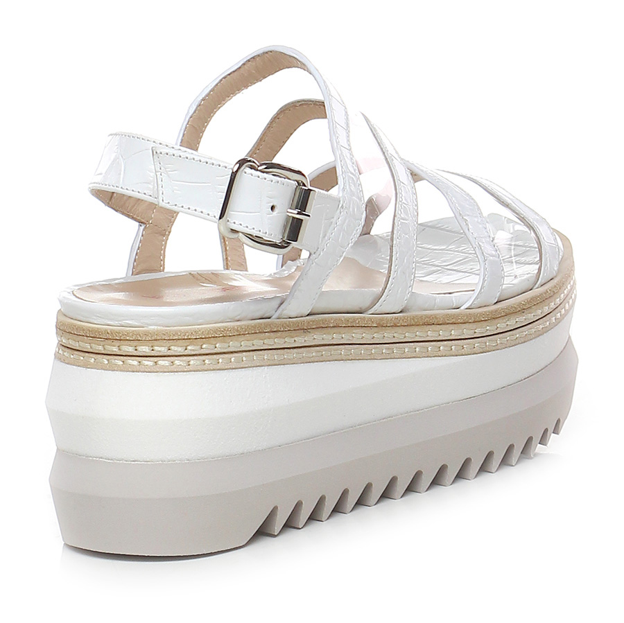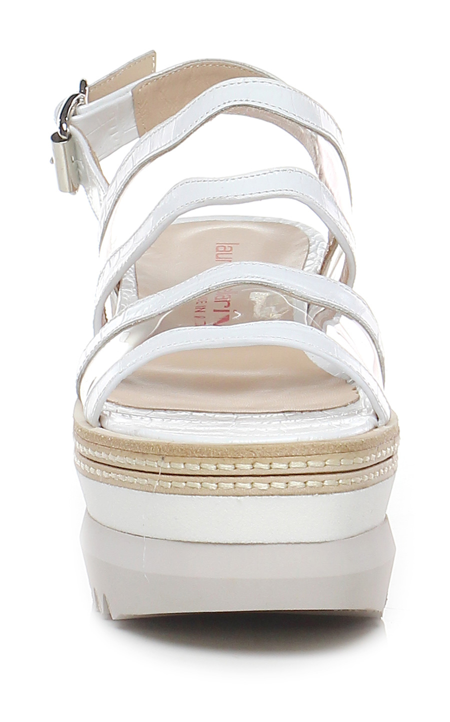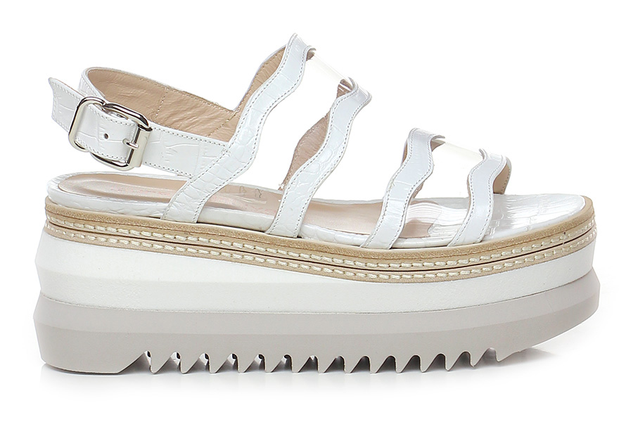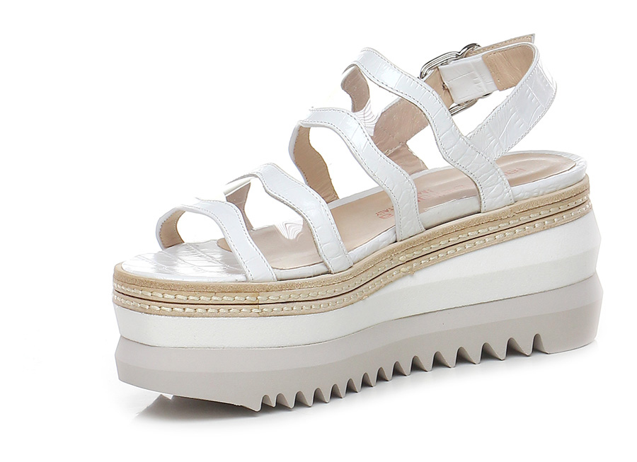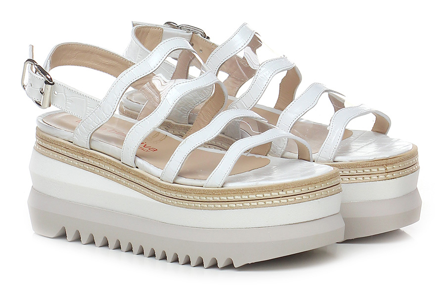 Wedge in crocodile print leather with front PVC inserts with strap on the back, extra light rubber sole. 85 heel, 60 platform with 25 bar.