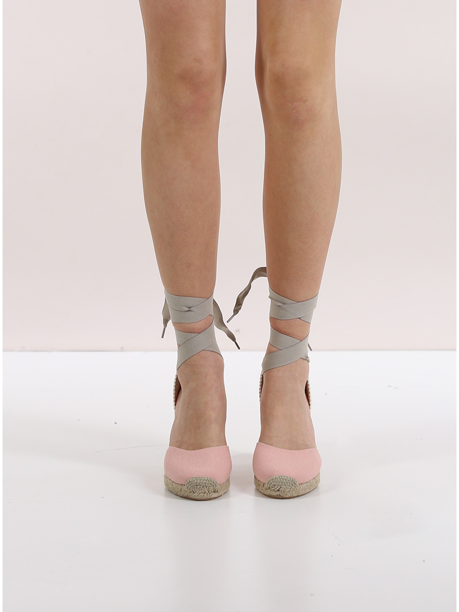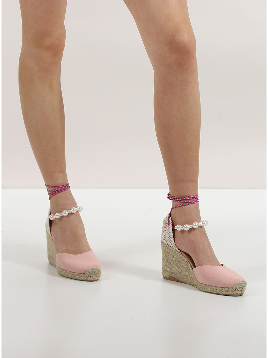 Wedge in fabric with ankle lace and accessory with removable pearls. Rubber sole. Heel height 90mm, platform 25mm with 65mm ledge. Rope lined wedge.