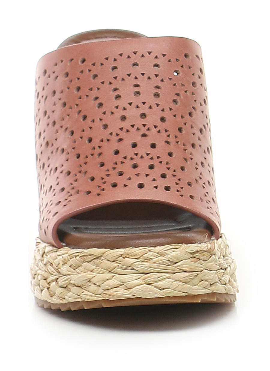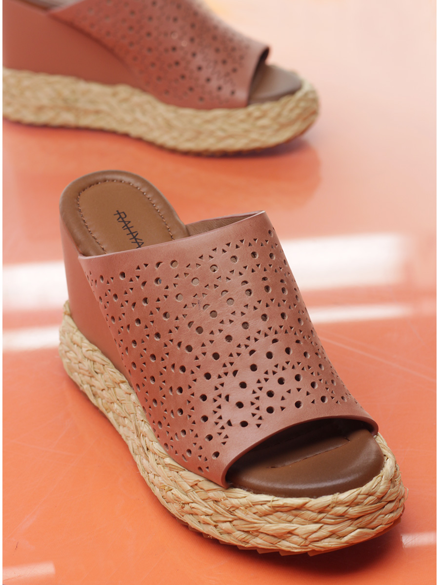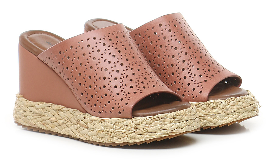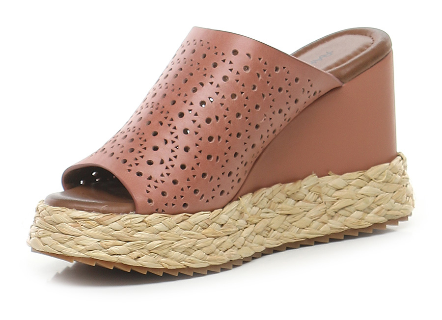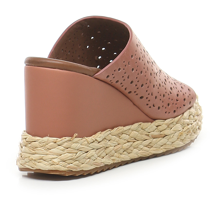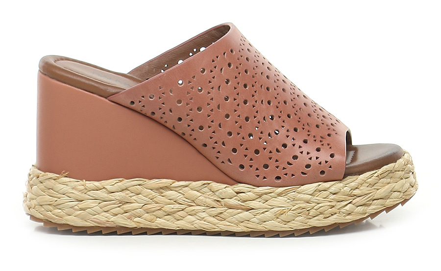 Perforated leather wedge with rubber sole. Heel height 95mm, platform 35mm with 60mm ledge. Wedge lined in leather and raffia-effect fabric.