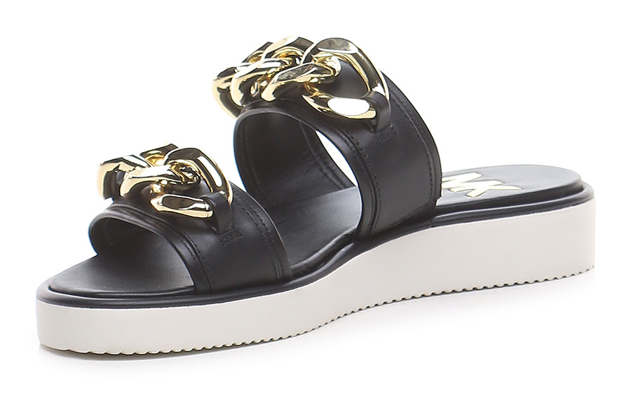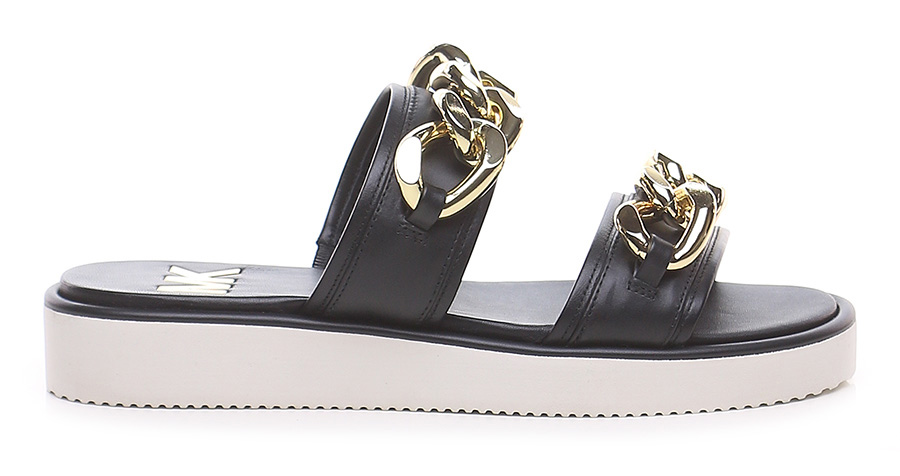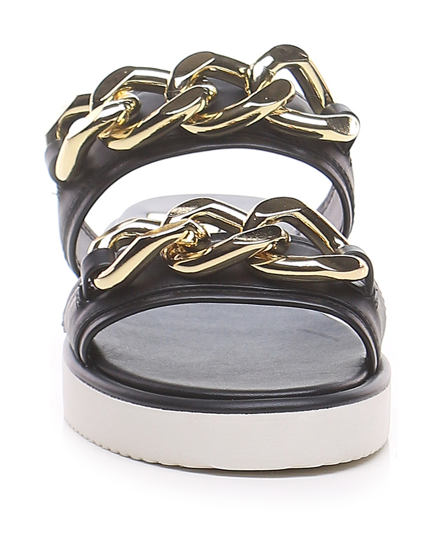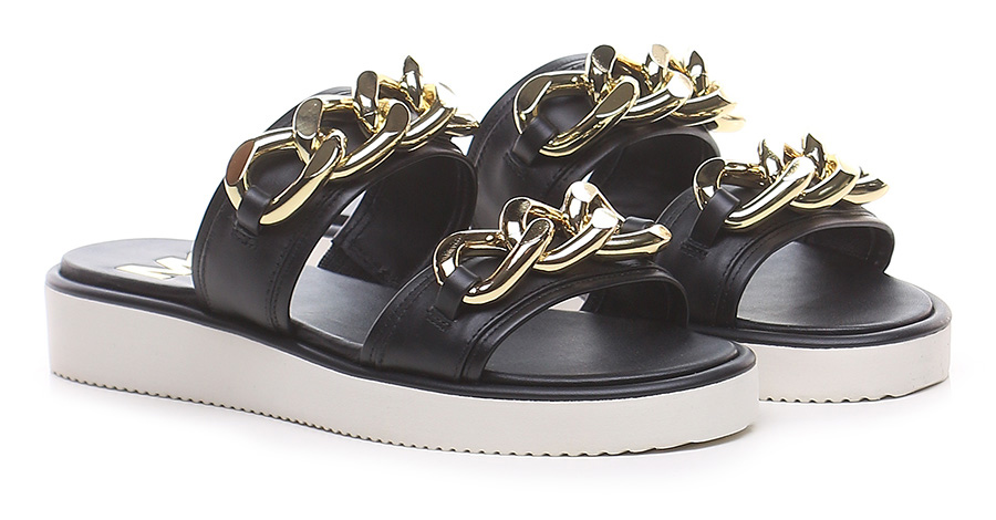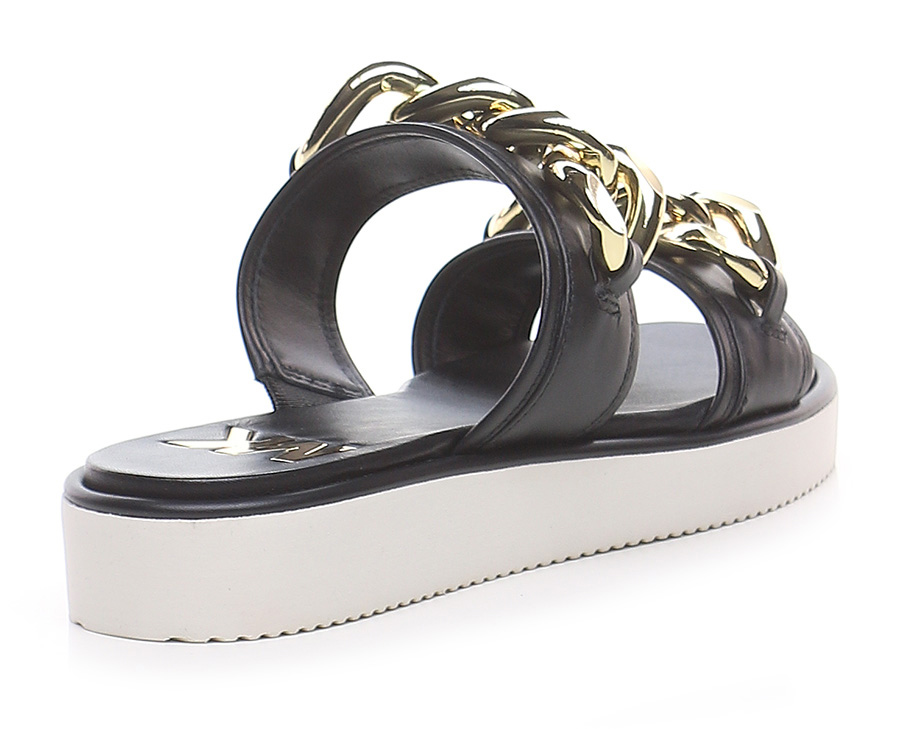 Sandalo in pelle con doppia catena frontale gold. Suola in gomma. Altezza tacco 35mm, platform 25mm con battuta 10mm.
