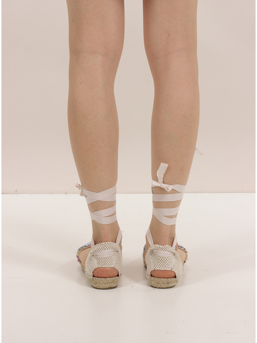 Scarpa in raffia e tessuto con laccio alla caviglia e suola in gomma. Altezza suola 25mm. Suola foderata in corda.