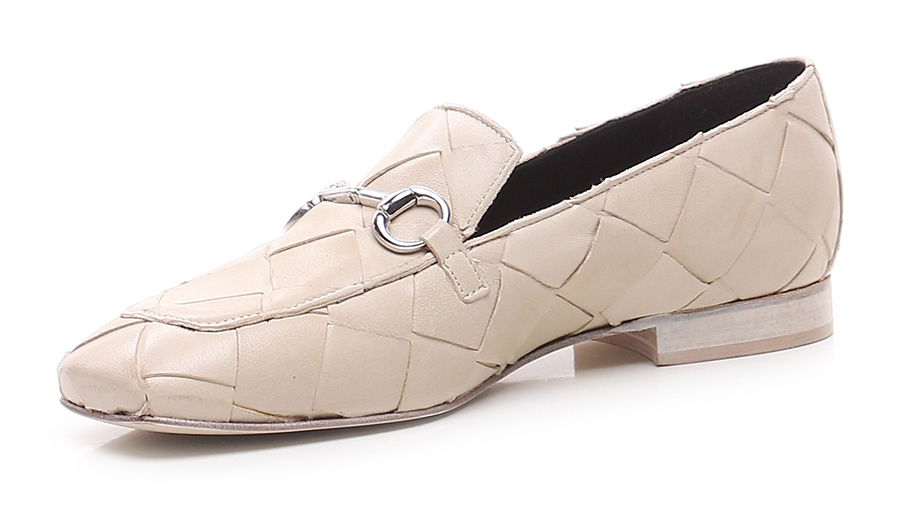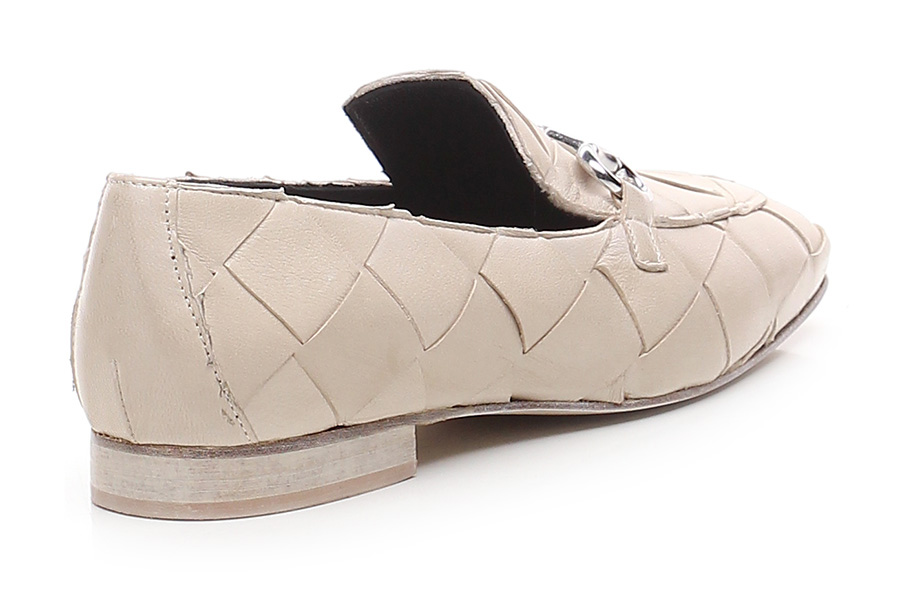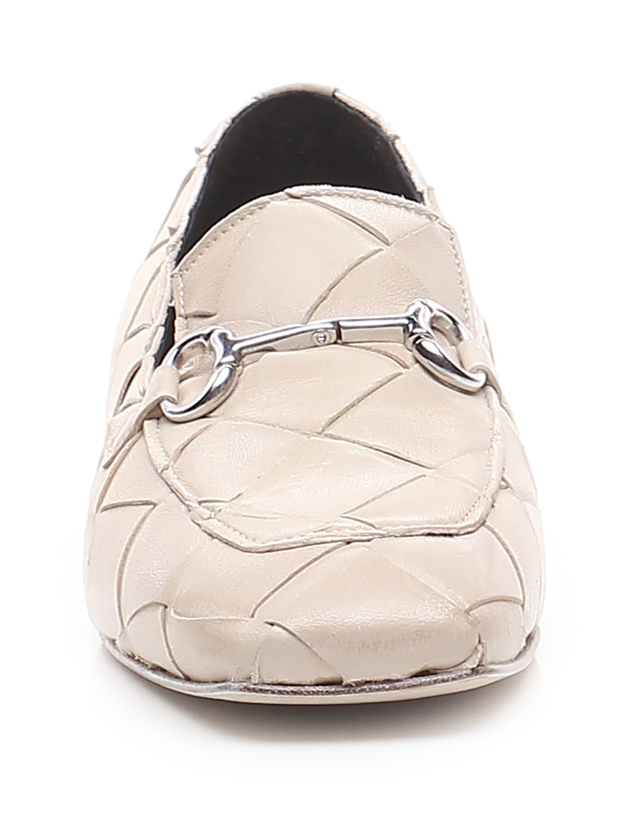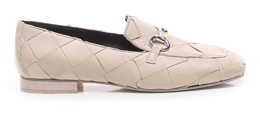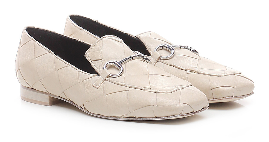 Scarpa bassa stile mocassino in pelle intrecciata con morsetto metallico frontale, suola in cuoio. Tacco 15. Punta quadrata.