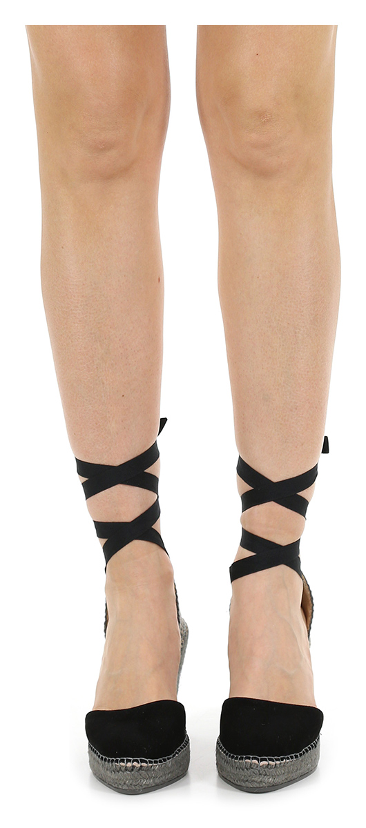 Zeppa in camoscio e tessuto con allacciatura alla caviglia, suola in gomma. Tacco 95, platform 30 con battuta 65.