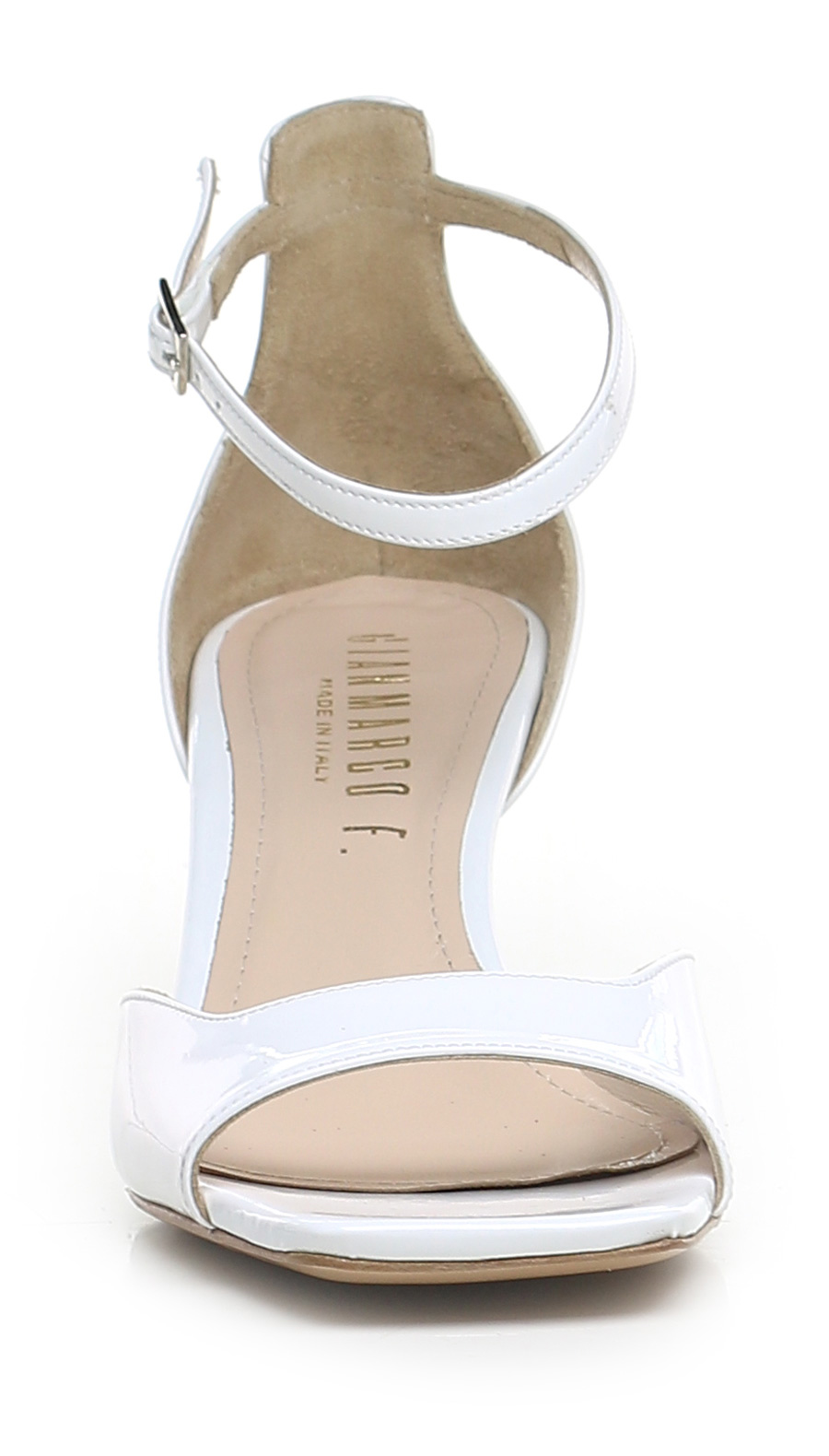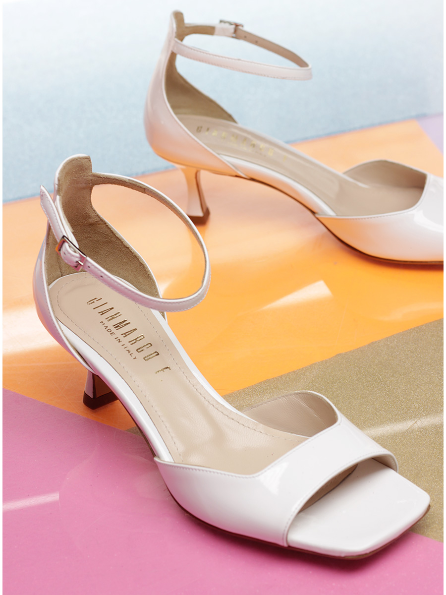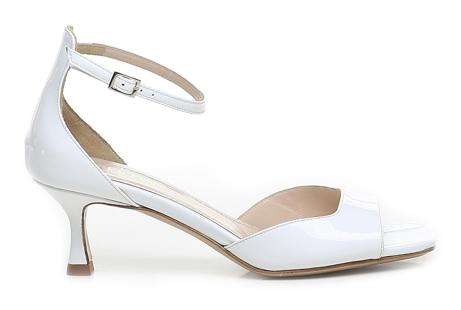 Sandalo in vernice con cinturino alla caviglia e suola in cuoio. Altezza tacco 60mm.