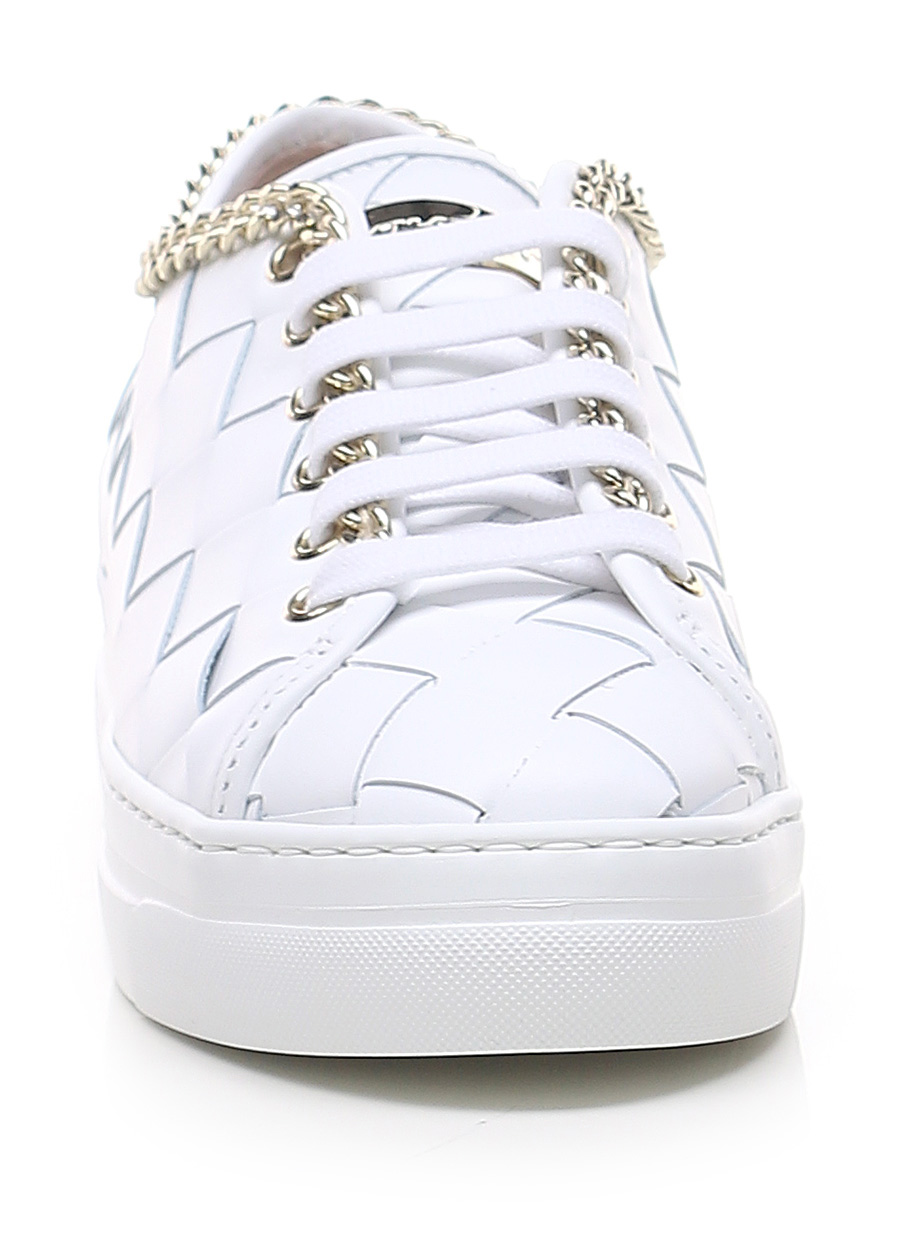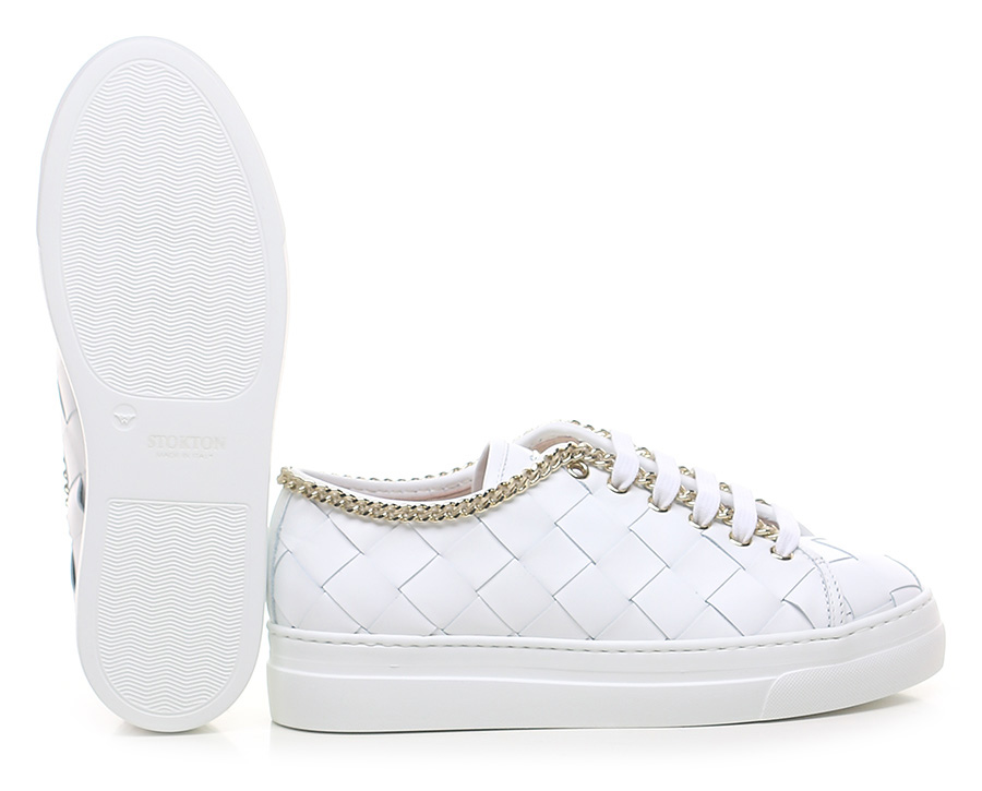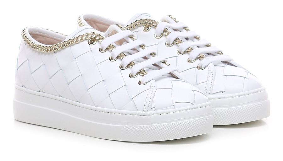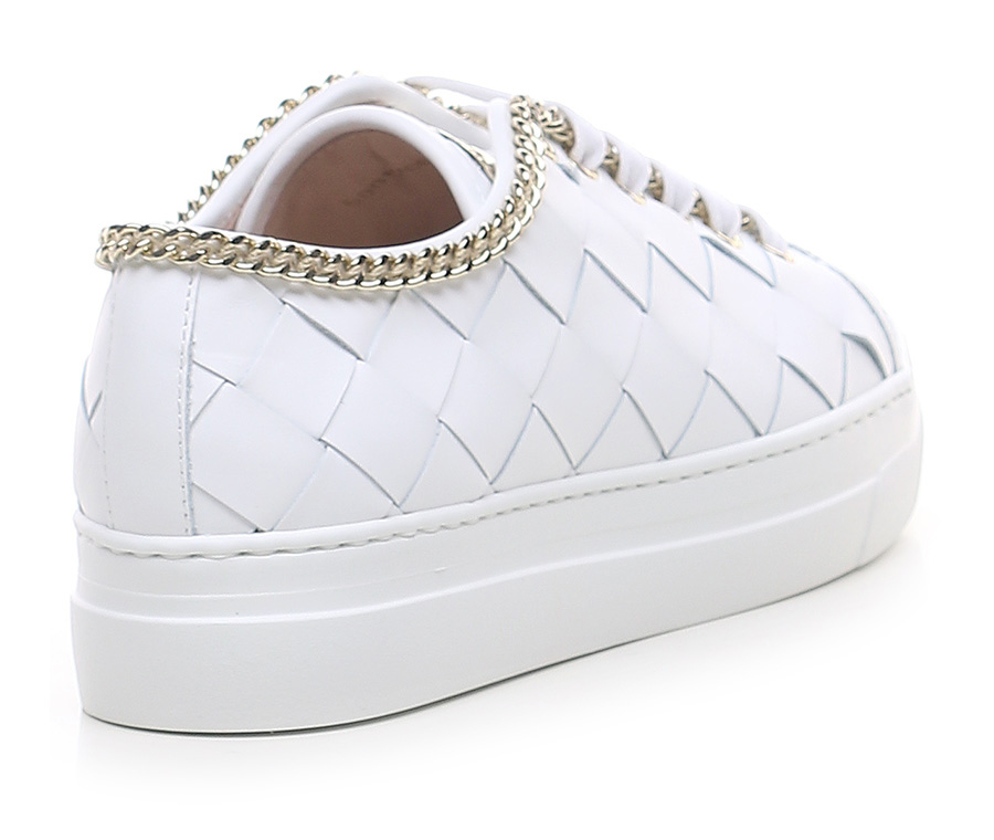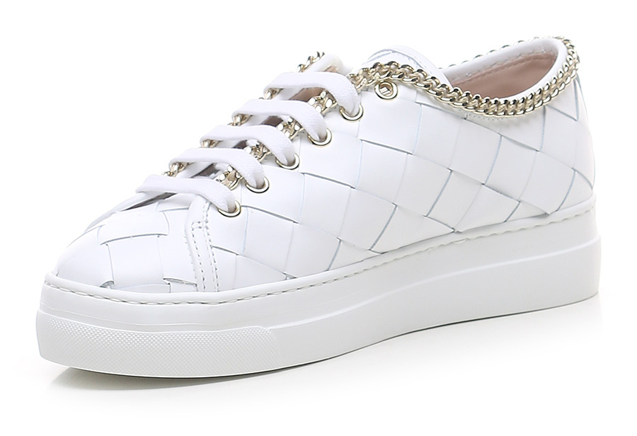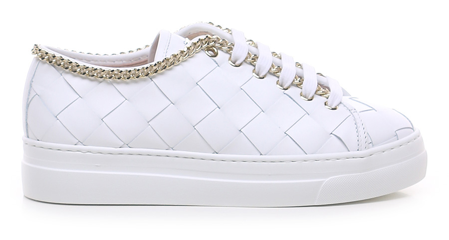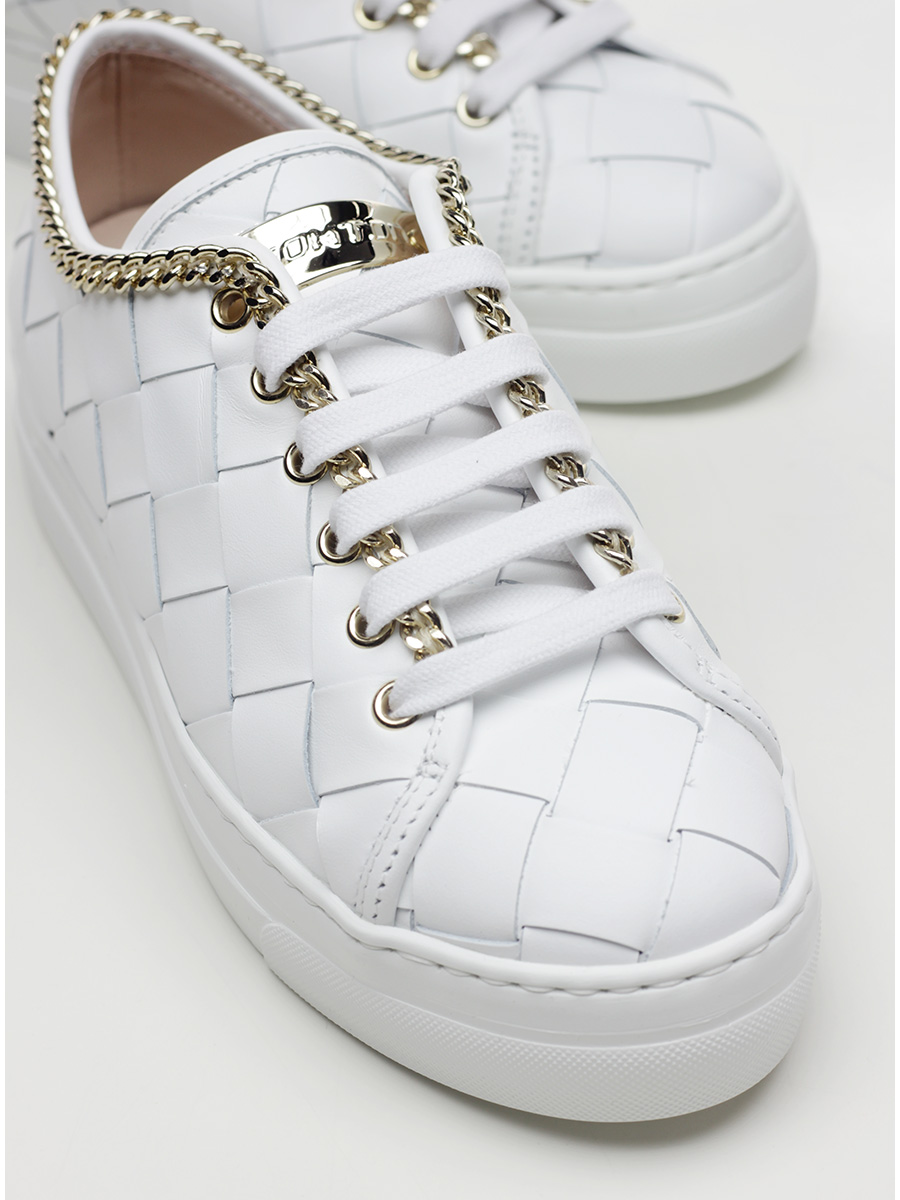 Sneaker in pelle intrecciata con accessorio metallico gold a catena su profilo tomaia. Suola in gomma. Altezza tacco 35mm, platform 30mm con battuta 5mm.