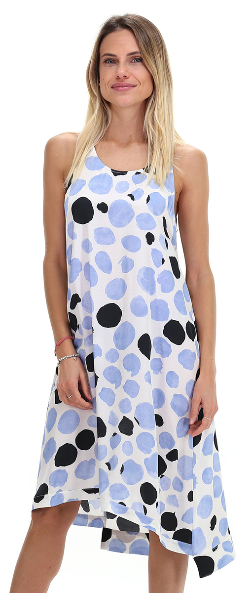 Abito svasato in viscosa con collo a giro. Fondo asimmetrico. Fantasia a pois bicolor. La modella è alta 1,68 m ed indossa la taglia 40.